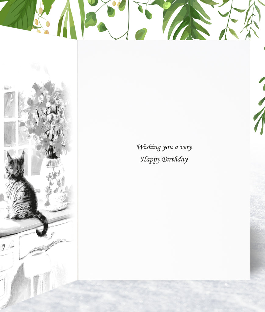 A high quality A5 (148 x 210mm) Kids Birthday Card. This card is produced from thick 300gsm quality card from sustainable sources and has a light sheen finish. The card features a lazy afternoon garden scene. Supplied with a quality envelope. Click the secondary image above to see the text printed inside the card. This design is part of a huge range of birthday cards, Christmas cards and social stationery from Olivia Samuel.