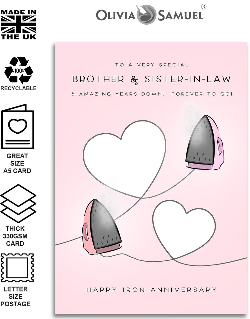 Brother & Sister-in-Law 6th Anniversary Card - Iron Wedding Anniversary Card - Iron Hearts Design - A5 Size Card with Grey Envelope