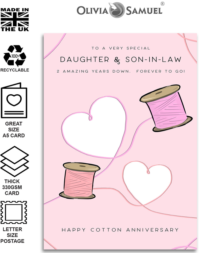 DAUGHTER & SON-IN-LAW 2 YEAR ANNIVERSARY CARD ⭐ Cotton Reels Design featuring an original Tom Price illustration.⭐ Click the second image for the text inside the card.