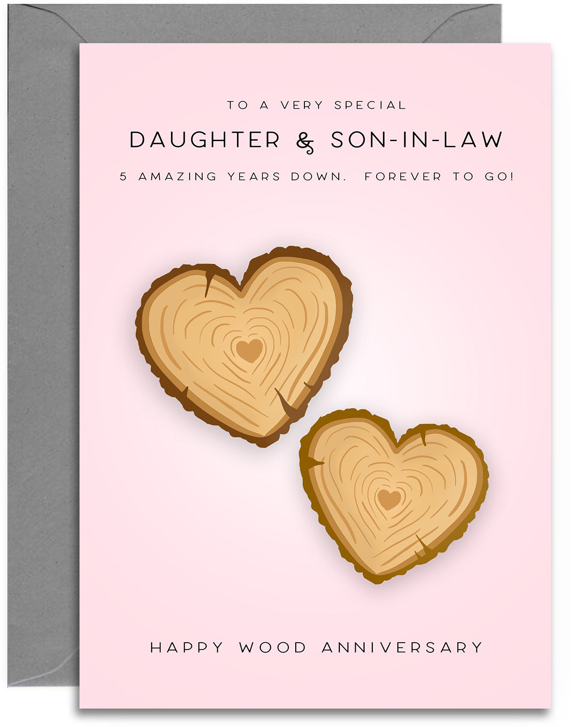 DAUGHTER & SON-IN-LAW 5 YEAR ANNIVERSARY CARD ⭐ Wood Hearts Design featuring an original Tom Price illustration.⭐ Click the second image for the text inside the card.