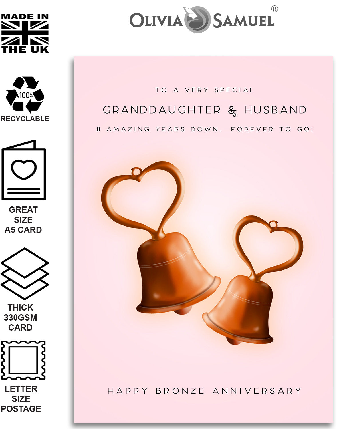 • GRANDDAUGHTER & HUSBAND 8 YEAR ANNIVERSARY CARD ⭐ Bronze Hearts Design featuring an original Tom Price illustration.⭐ Click the second image for the text inside the card.