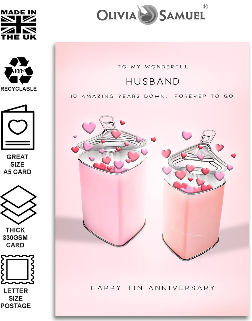 HUSBAND 10 YEAR ANNIVERSARY CARD ⭐ Tin Hearts Design featuring an original Tom Price illustration.⭐ Click the second image for the text inside the card.