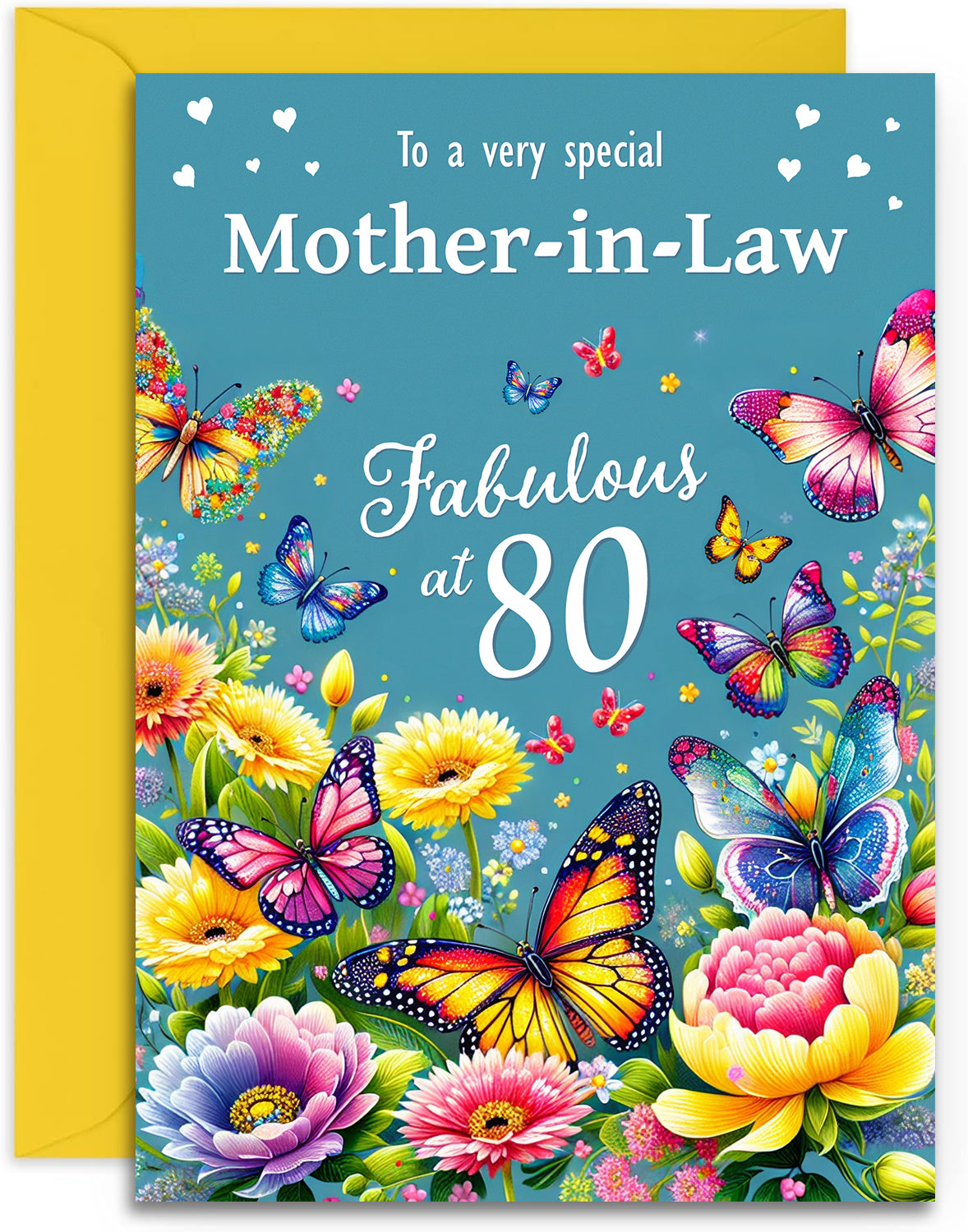 Mother in Law 80th Birthday Card - Happy Birthday - Fabulous at 80 - Pretty Flowers and Butterflies - A5 Size Card with Yellow Envelope