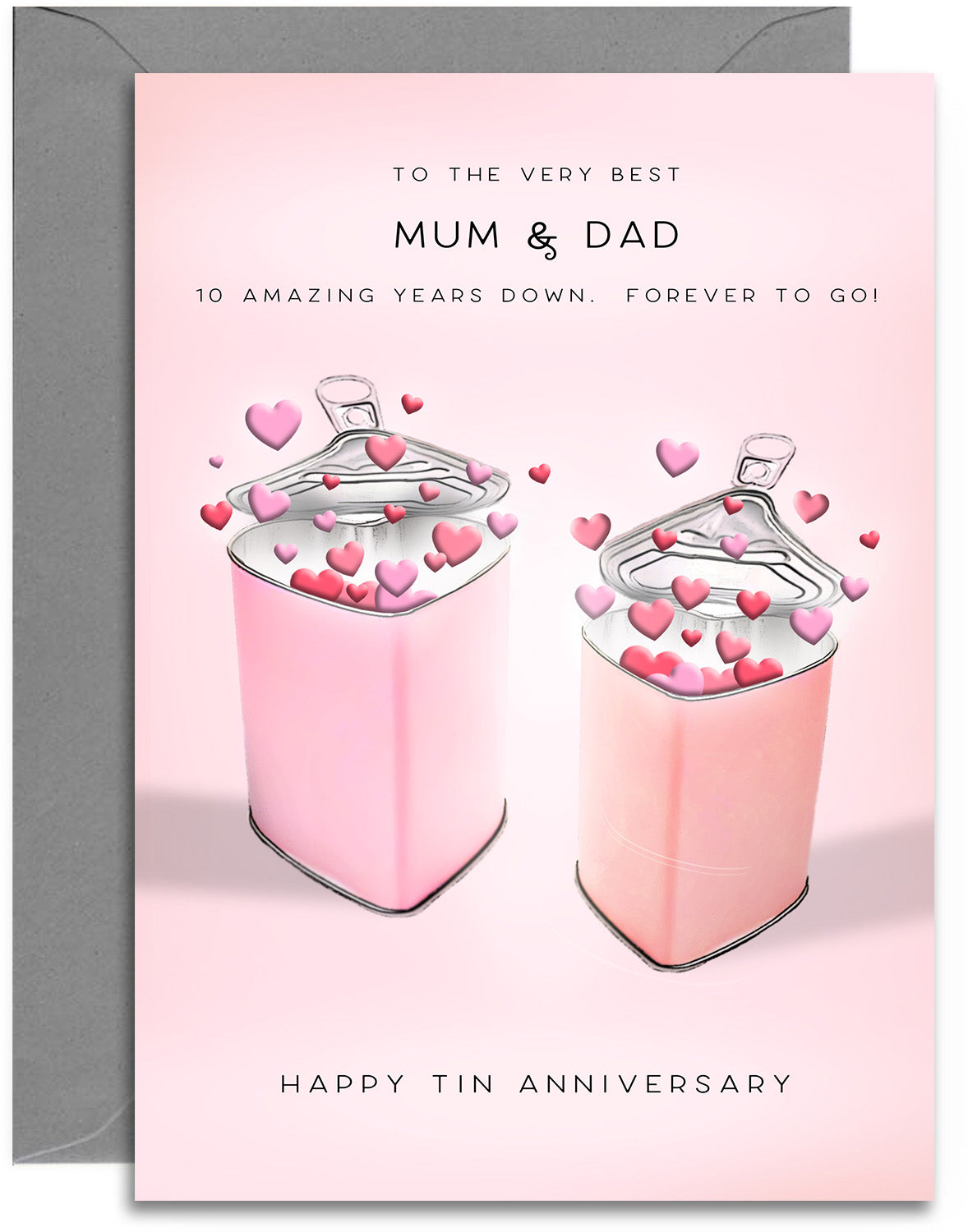 MUM & DAD 10 YEAR ANNIVERSARY CARD ⭐ Tin Hearts Design featuring an original Tom Price illustration.⭐ Click the second image for the text inside the card.