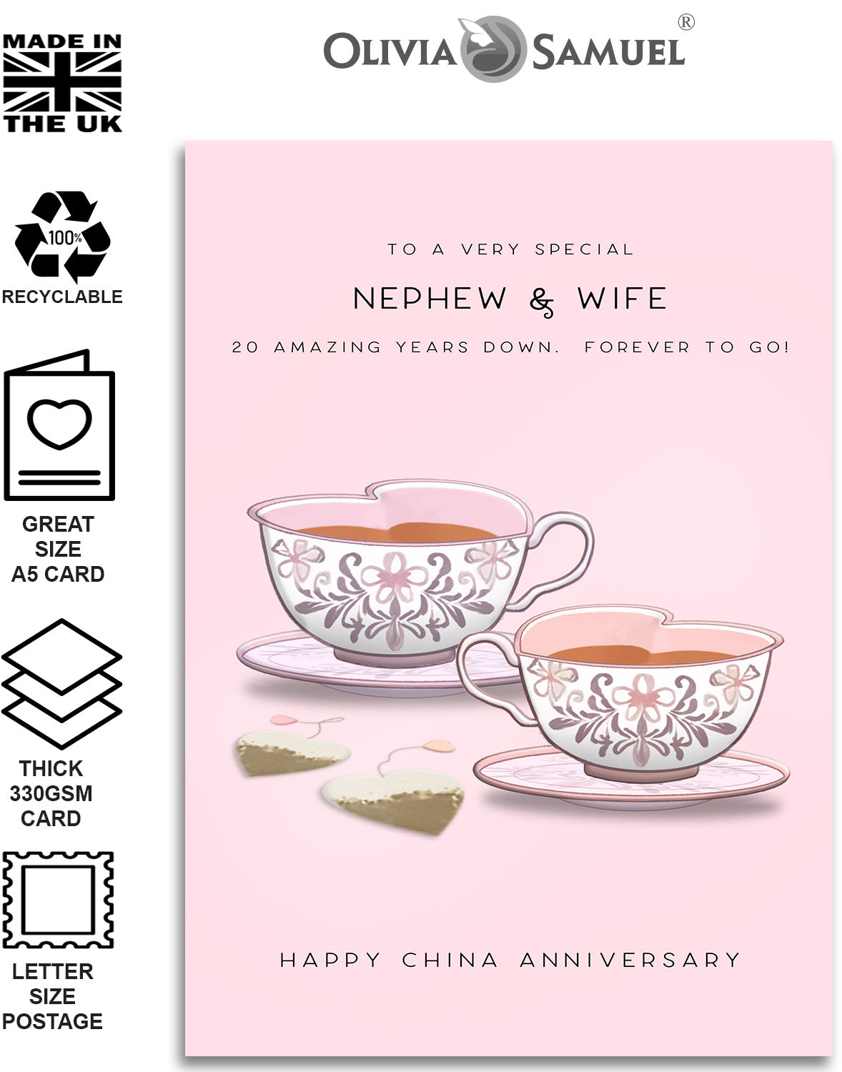 Nephew & Wife 20th Anniversary Card - China Wedding Anniversary Card - China Hearts Design - A5 Size Card with Grey Envelope is backordered and will ship as soon as it is back in stock.