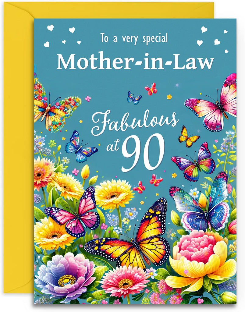 Mother in Law 90th Birthday Card - Happy Birthday - Fabulous at 90 - Pretty Flowers and Butterflies - A5 Size Card with Yellow Envelope