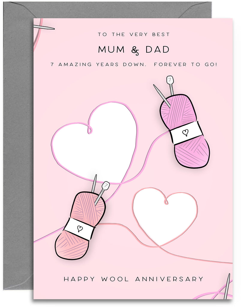 Mum & Dad 7th Anniversary Card - Wool Wedding Anniversary Card - Wool Hearts Design - A5 Size Card with Grey Envelope