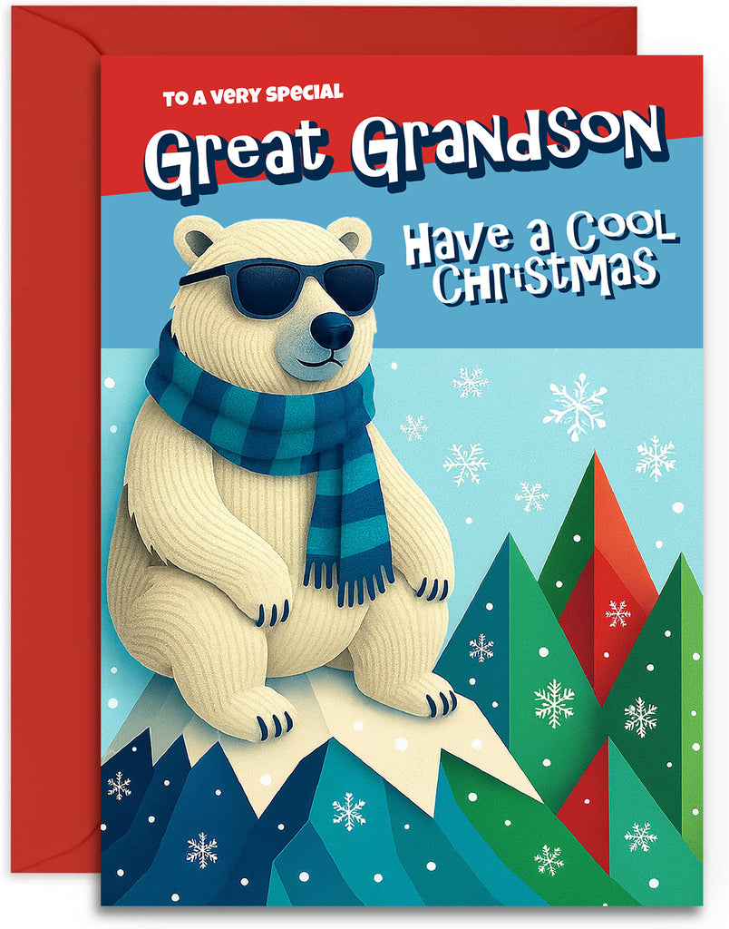 Great Grandson Christmas Card - Cool Polar Bear - A5 Size Card with Red Envelope
