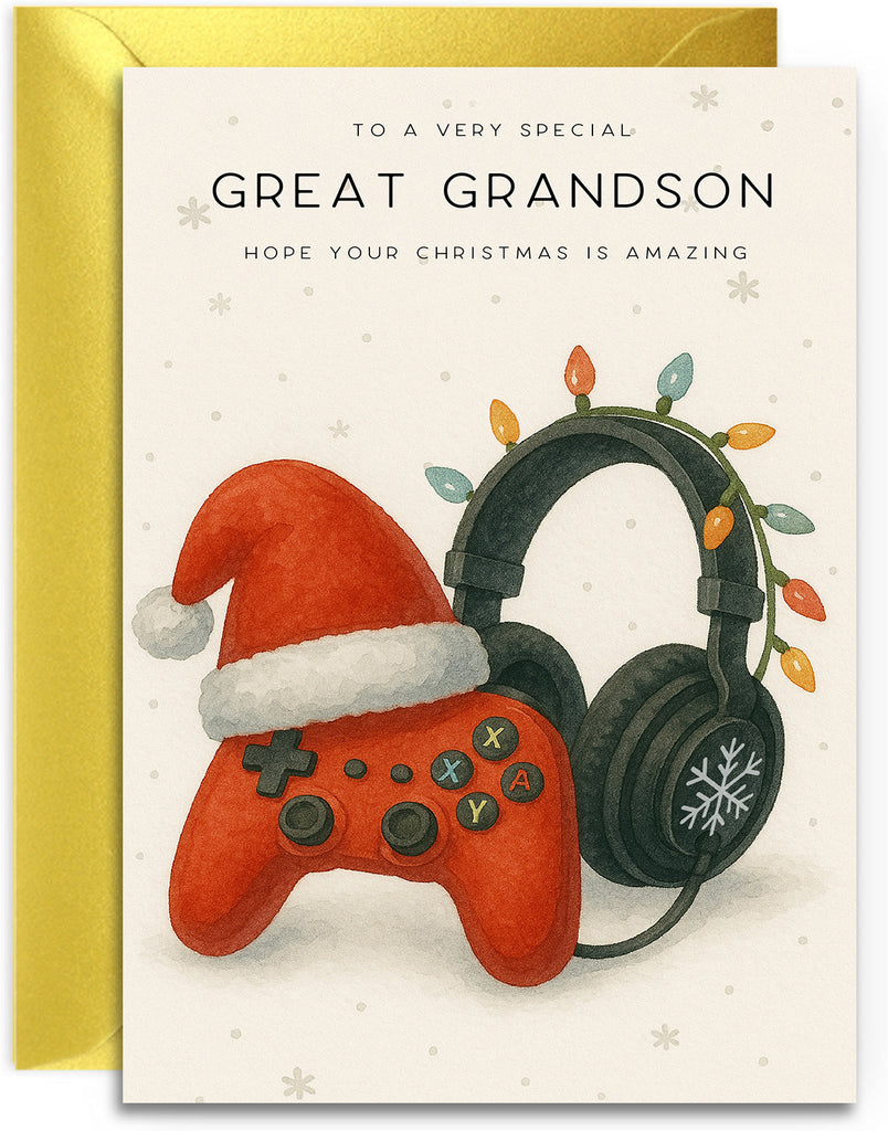 Great Grandson Christmas Card - Gaming Controller Design - A5 Size Card with Gold Envelope