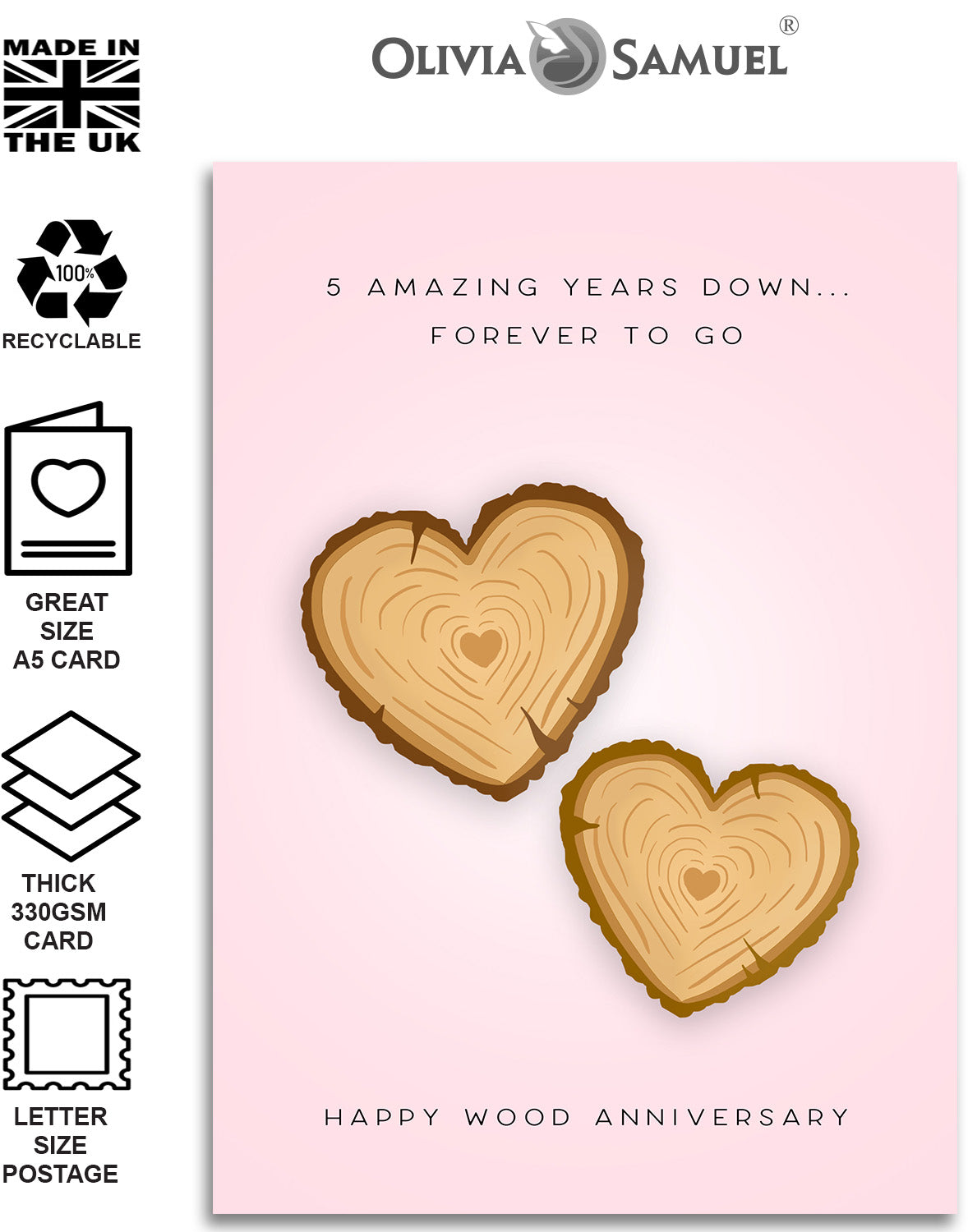 • 5 YEAR ANNIVERSARY CARD ⭐ Wood Hearts Design featuring an original Tom Price illustration.⭐ Click the second image for the text inside the card.
