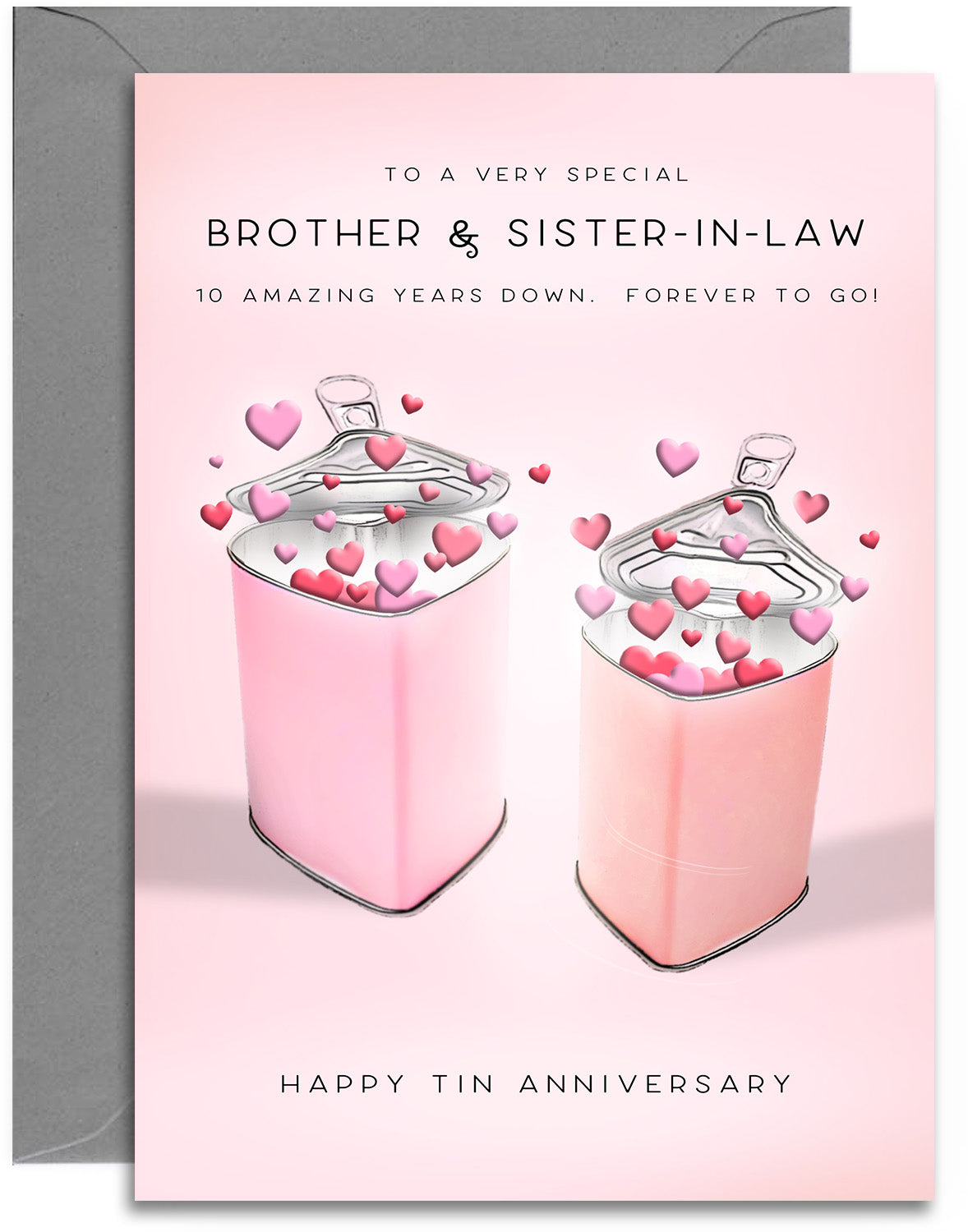 Brother & Sister-in-Law 10th Anniversary Card - Tin Wedding Anniversary Card - Tin Hearts Design - A5 Size Card with Grey Envelope