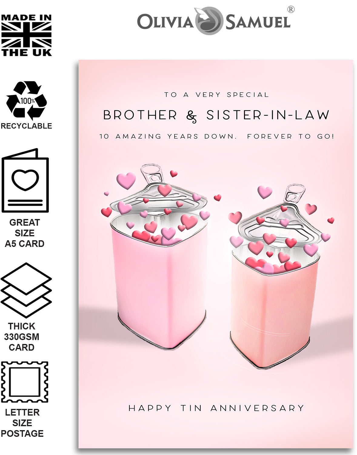 - BROTHER & SISTER-IN-LAW 10 YEAR ANNIVERSARY CARD ⭐ Tin Hearts Design featuring an original Tom Price illustration.⭐ Click the second image for the text inside the card.