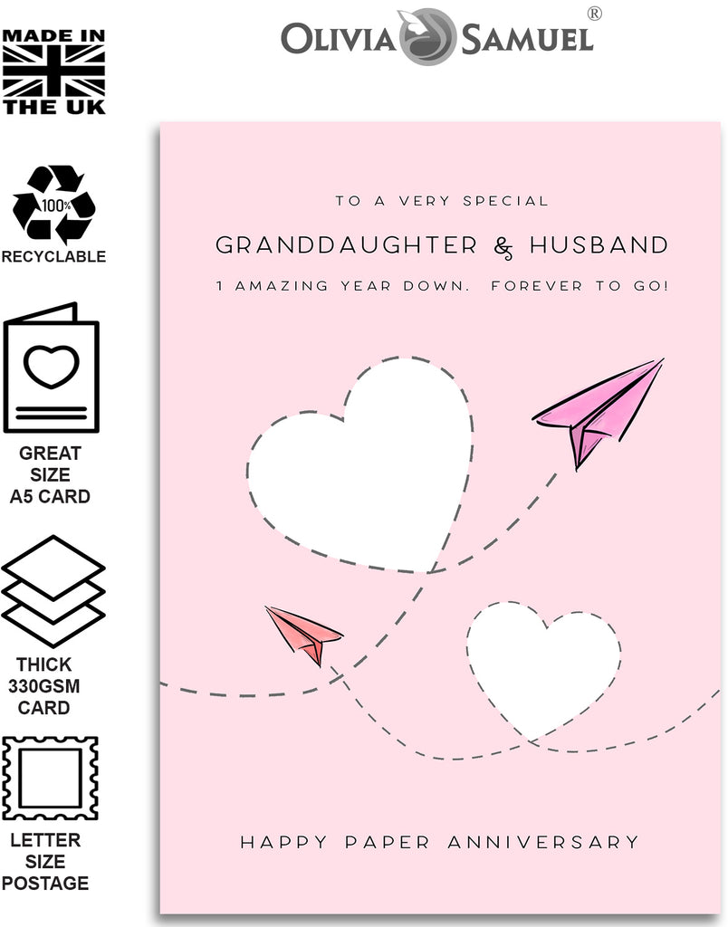 Granddaughter & Husband 1st Anniversary Card - Paper Wedding Anniversary Card - Paper Planes Design - A5 Size Card with Grey Envelope