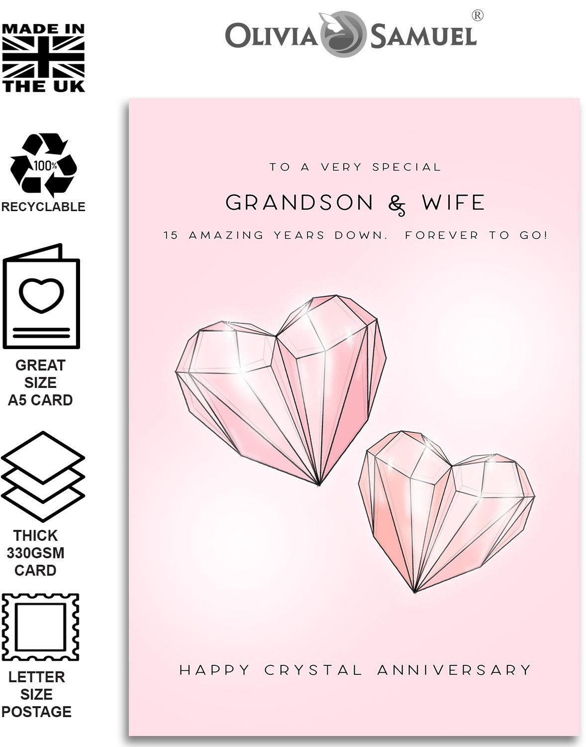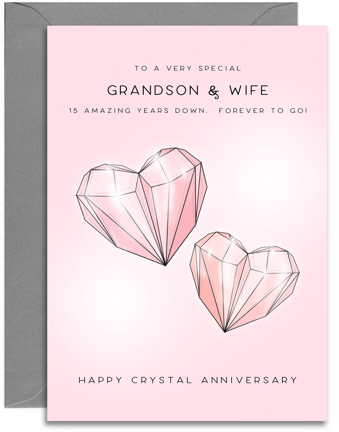 Grandson & Wife 15th Anniversary Card - Crystal Wedding Anniversary Card - Crystal Hearts Design - A5 Size Card with Grey Envelope