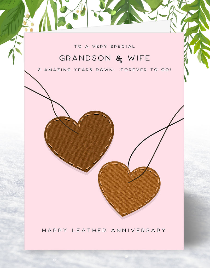 GRANDSON & WIFE 3 YEAR ANNIVERSARY CARD ⭐ Leather Hearts Design featuring an original Tom Price illustration.⭐ Click the second image for the text inside the card.