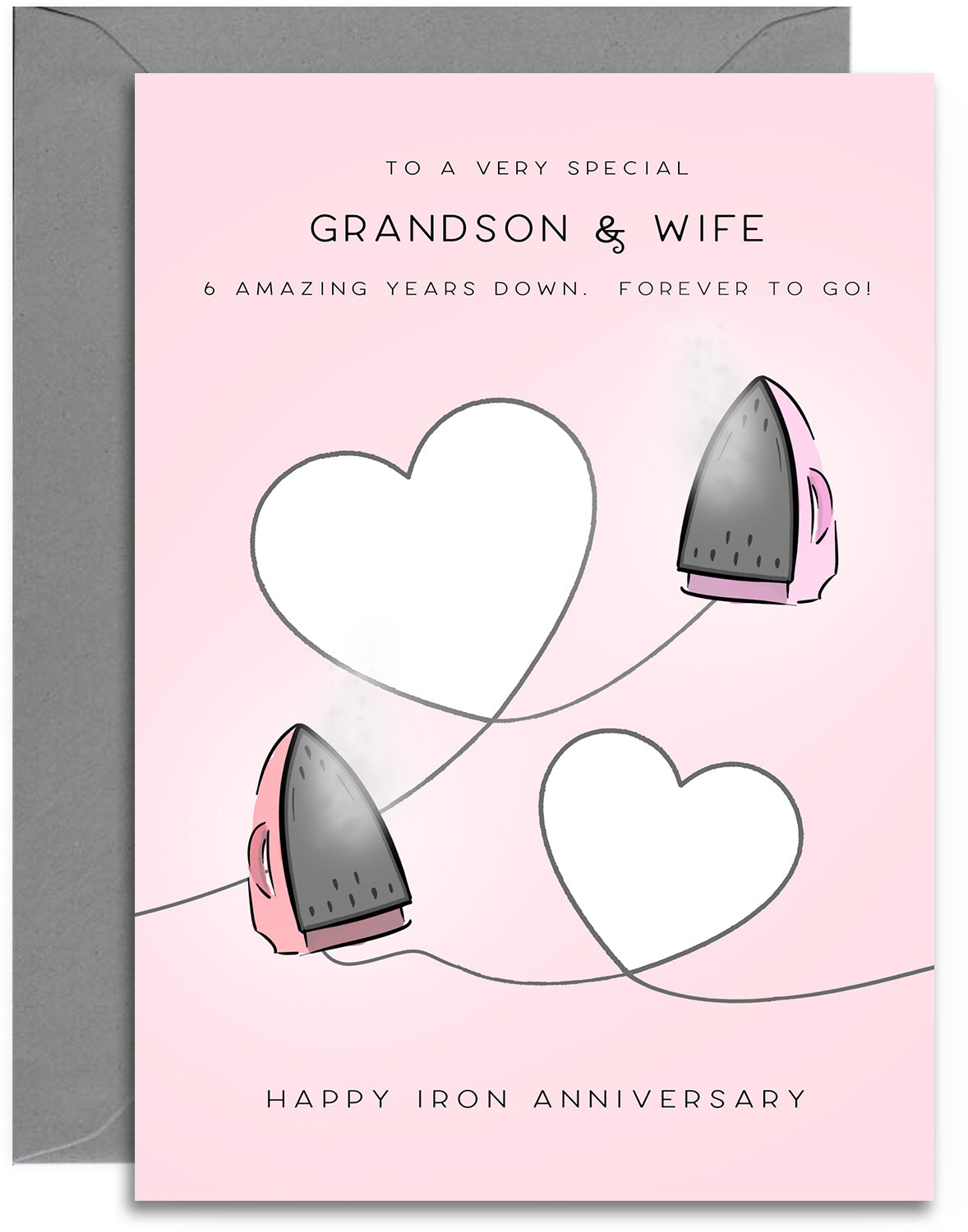 Grandson & Wife 6th Anniversary Card - Iron Wedding Anniversary Card - Iron Hearts Design - A5 Size Card with Grey Envelope