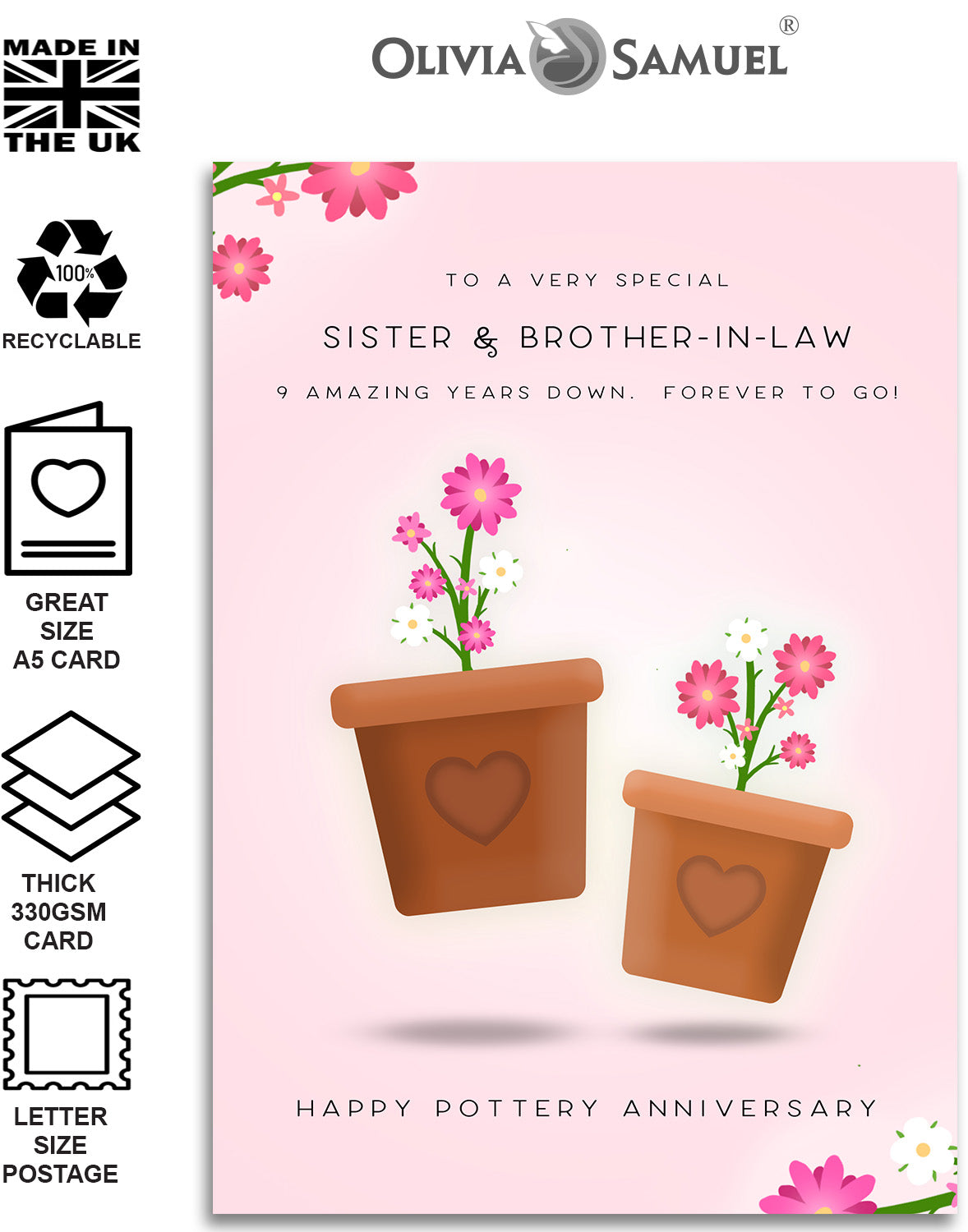 - SISTER & BROTHER-IN-LAW 9 YEAR ANNIVERSARY CARD ⭐ Pottery Hearts Design featuring an original Tom Price illustration.⭐ Click the second image for the text inside the card.