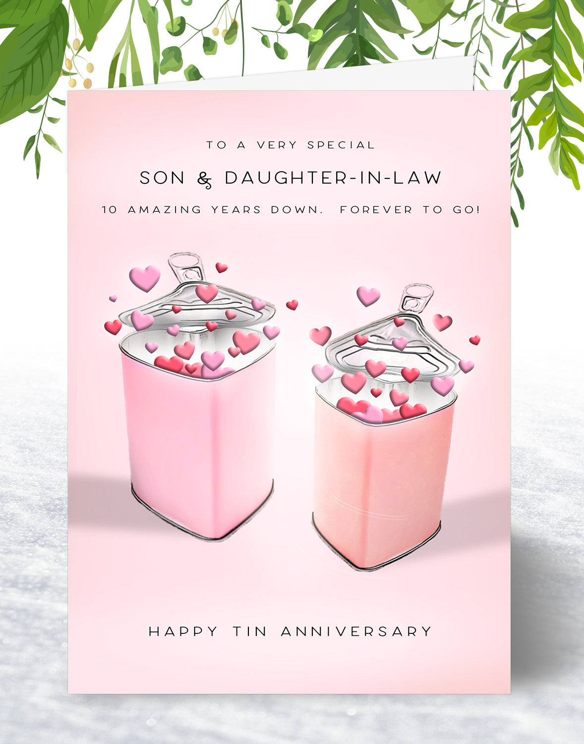 • SON & DAUGHTER-IN-LAW 10 YEAR ANNIVERSARY CARD ⭐ Tin Hearts Design featuring an original Tom Price illustration.⭐ Click the second image for the text inside the card.