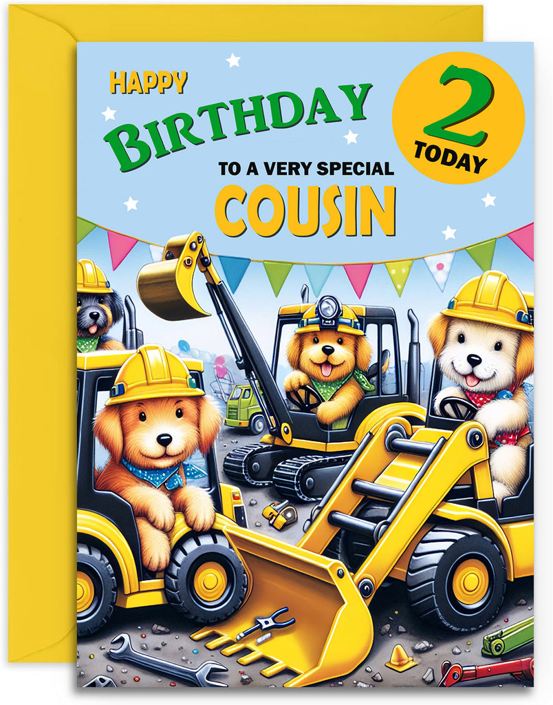 Cousin Kids 2nd Birthday Card - Doggy Digger Crane Design for Age 2 Boy Cousin - A5 Size Card with Yellow Envelope