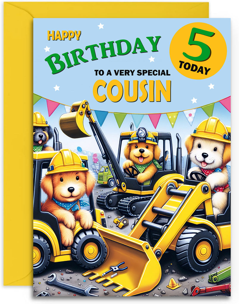 Cousin Kids 5th Birthday Card - Doggy Digger Crane Design for Age 5 Boy Cousin - A5 Size Card with Yellow Envelope