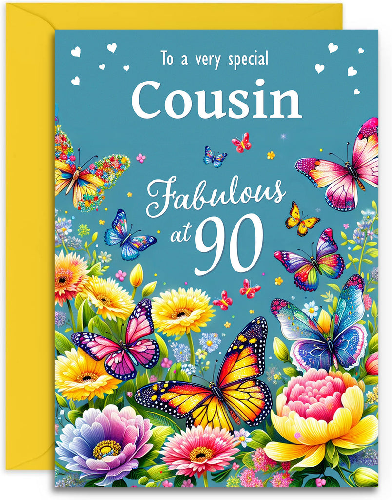 Cousin Female 90th Birthday Card - Happy Birthday - Fabulous at 90 - Pretty Flowers and Butterflies - A5 Size Card with Yellow Envelope