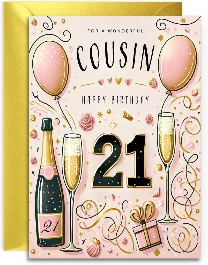 Cousin 21st Birthday Card - Champagne and Balloons design - Elegant Birthday Card for Her Age 21 with lovely verse inside. A5 with Gold Envelope