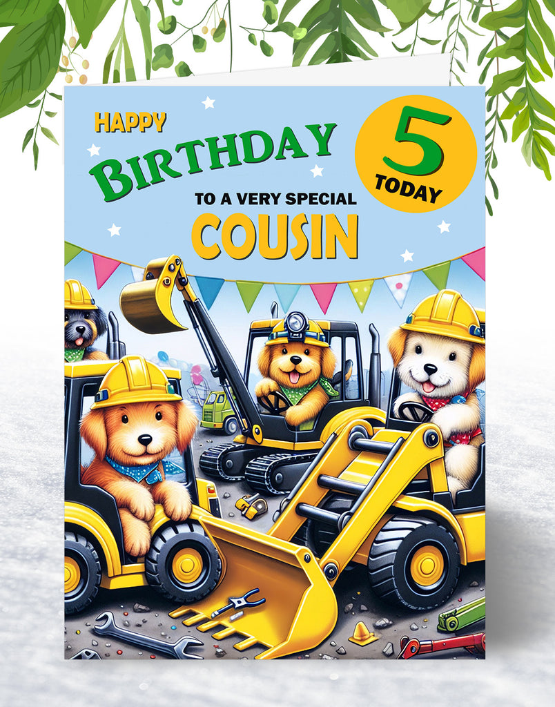 COUSIN KIDS DIGGER 5TH BIRTHDAY CARD ⭐ Fun colourful digger construction design with adorable doggies ⭐ Click the second image for the text inside the card.