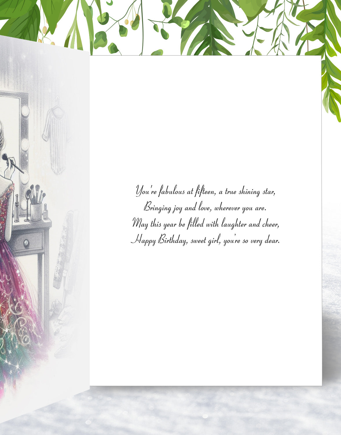 • DAUGHTER 15TH BIRTHDAY CARD ⭐ Teenager getting ready for party design specifically for a 15-year-old Daughter ⭐ Click the second image for the text inside the card.