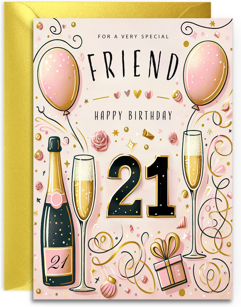 Friend 21st Birthday Card - Champagne and Balloons design - Elegant Birthday Card for Her Age 21 with lovely verse inside. A5 with Gold Envelope