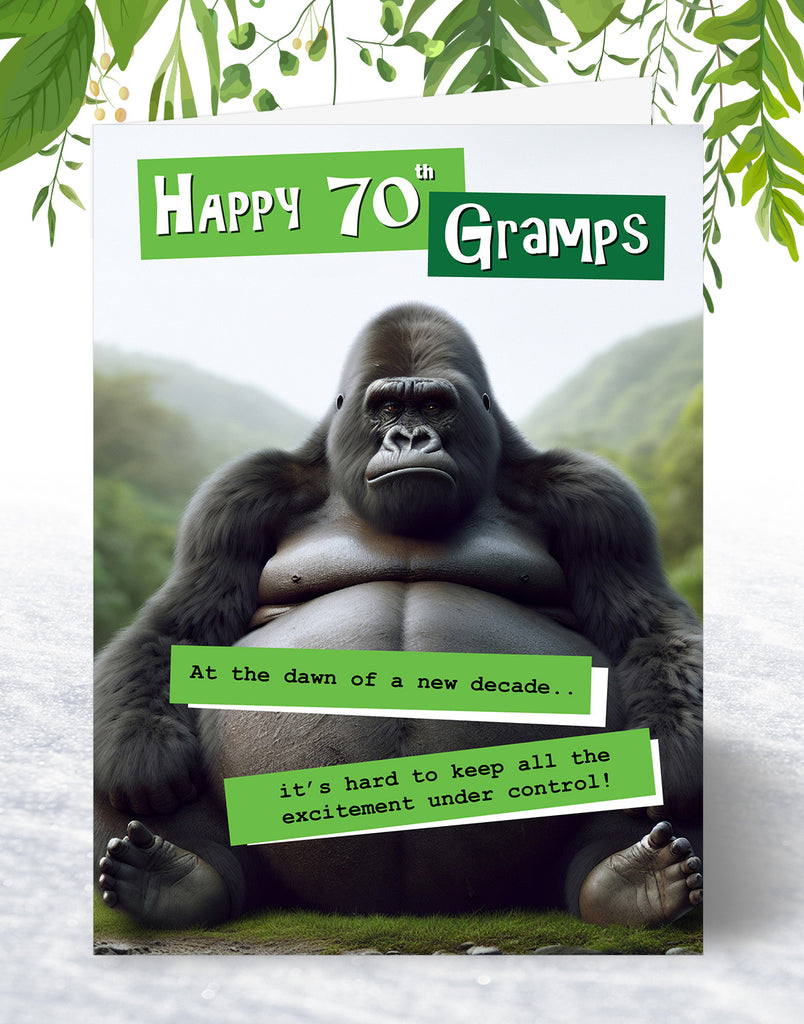Funny Gramps 70th Birthday Card - Grumpy Gorilla Design for Him - Fun Age 70 Happy Birthday Card for Gramps - A5 Size Card with Yellow Envelope is backordered and will ship as soon as it is back in stock.