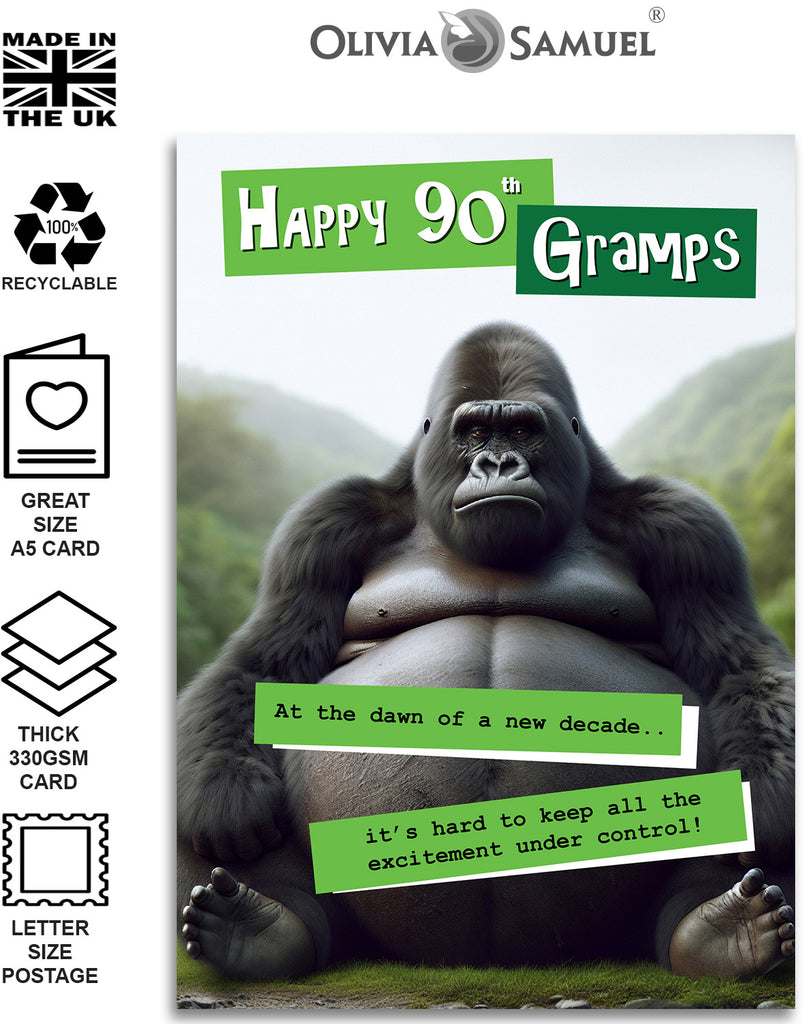 Funny Gramps 90th Birthday Card - Grumpy Gorilla Design for Him - Fun Age 90 Happy Birthday Card for Gramps - A5 Size Card with Yellow Envelope (Copy) is backordered and will ship as soon as it is back in stock.