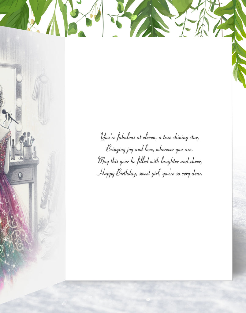 GRANDDAUGHTER 11TH BIRTHDAY CARD ⭐ Teenager getting ready for party design specifically for a 11-year-old Granddaughter ⭐ Click the second image for the text inside the card.
