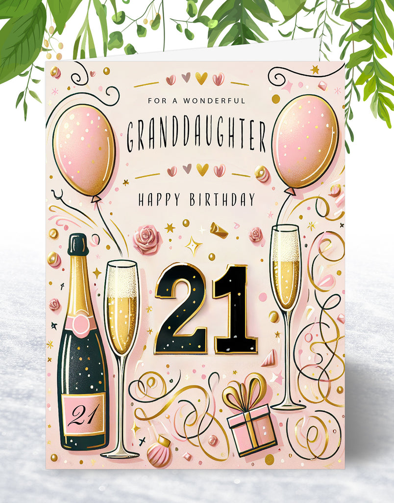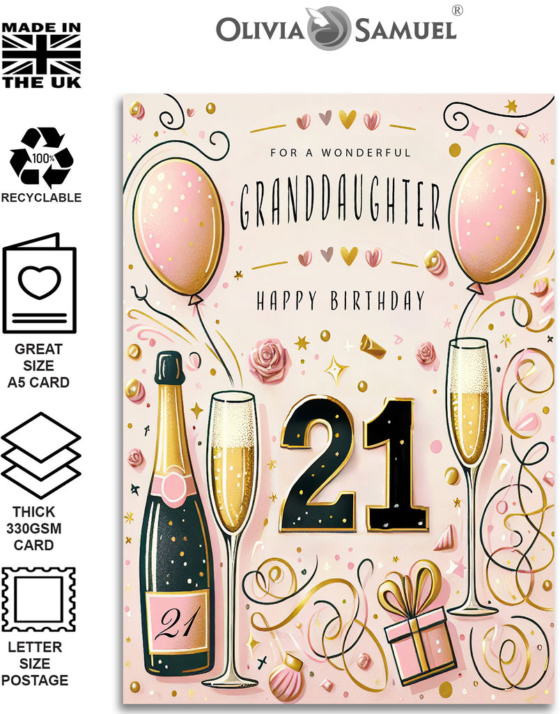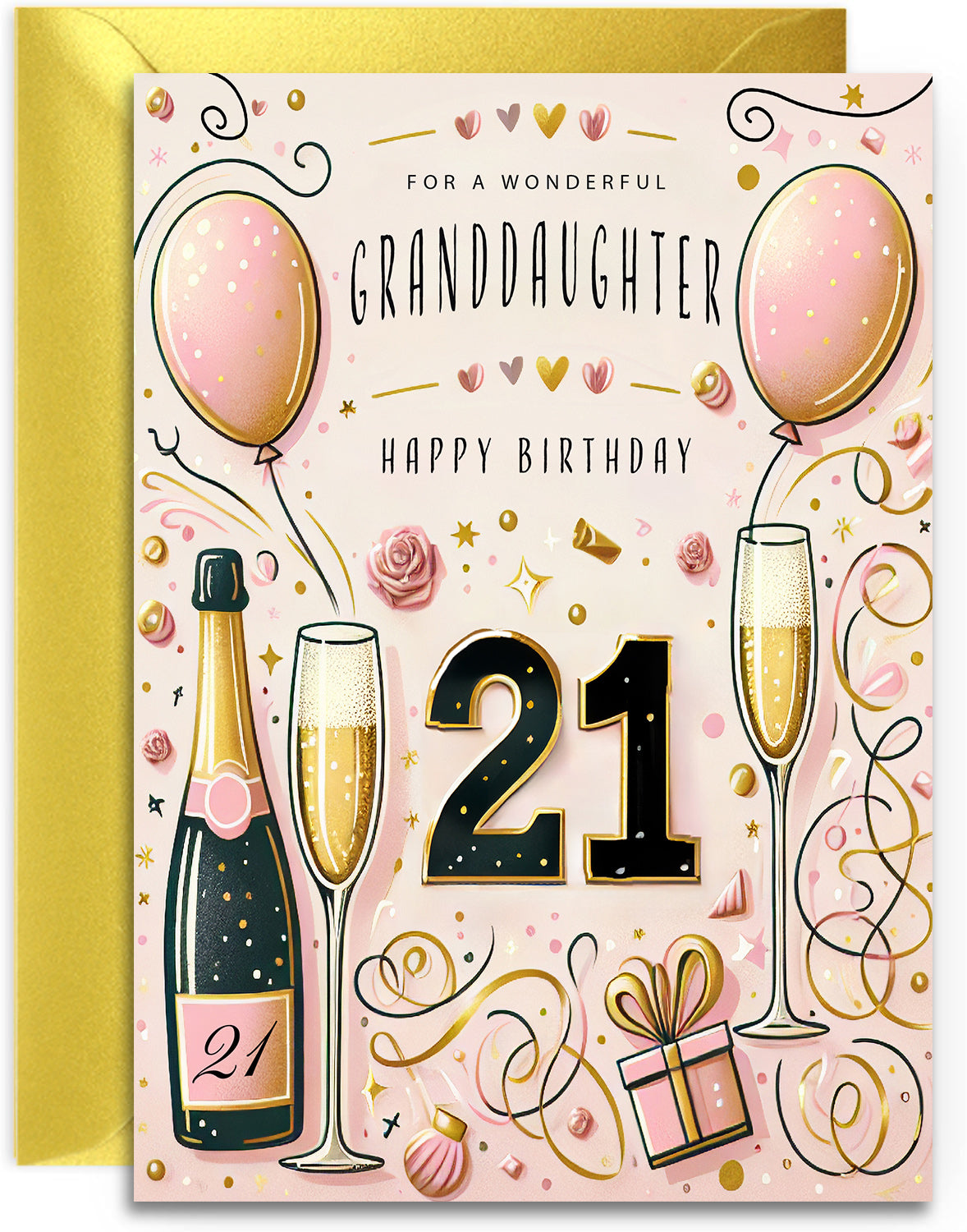 Granddaughter 21st Birthday Card - Champagne and Balloons design - Elegant Birthday Card for Her Age 21 with lovely verse inside. A5 with Gold Envelope