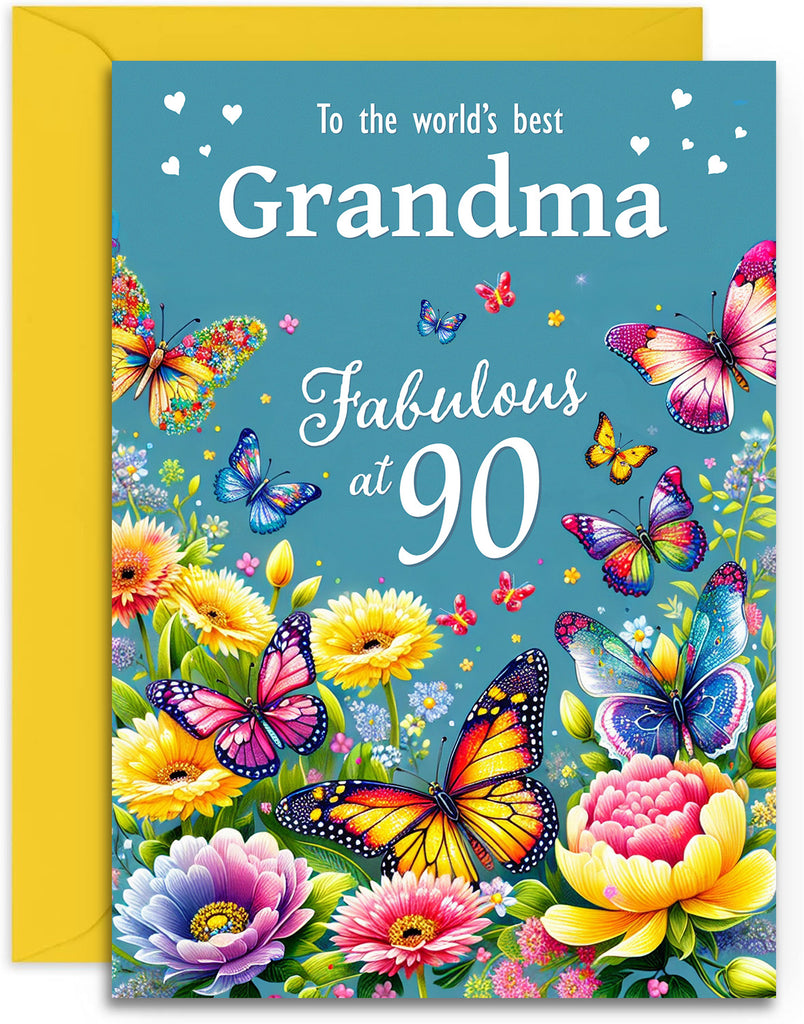 Grandma 90th Birthday Card - Happy Birthday - Fabulous at 90 - Pretty Flowers and Butterflies - A5 Size Card with Yellow Envelope