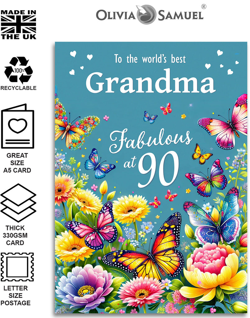 Grandma 90th Birthday Card - Happy Birthday - Fabulous at 90 - Pretty Flowers and Butterflies - A5 Size Card with Yellow Envelope is backordered and will ship as soon as it is back in stock.