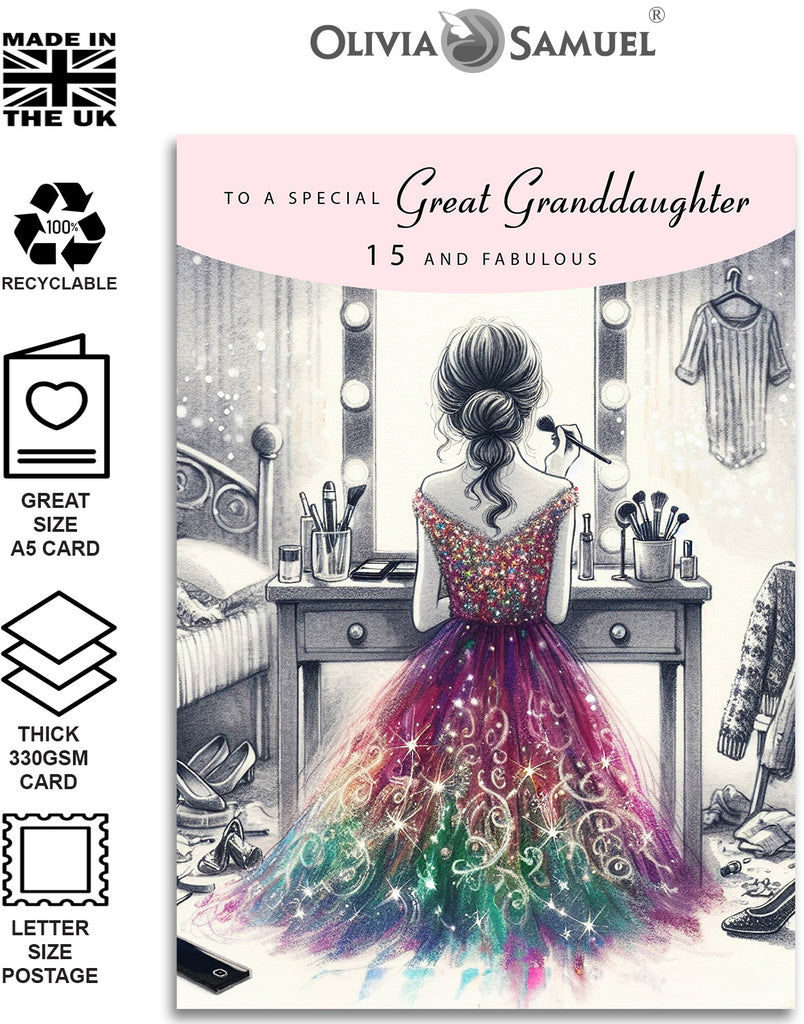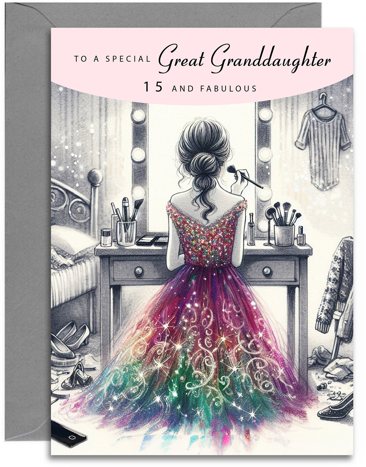 GREAT GRANDDAUGHTER 15TH BIRTHDAY CARD ⭐ Teenager getting ready for party design specifically for a 15-year-old Great Granddaughter ⭐ Click the second image for the text inside the card.