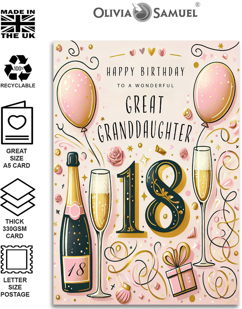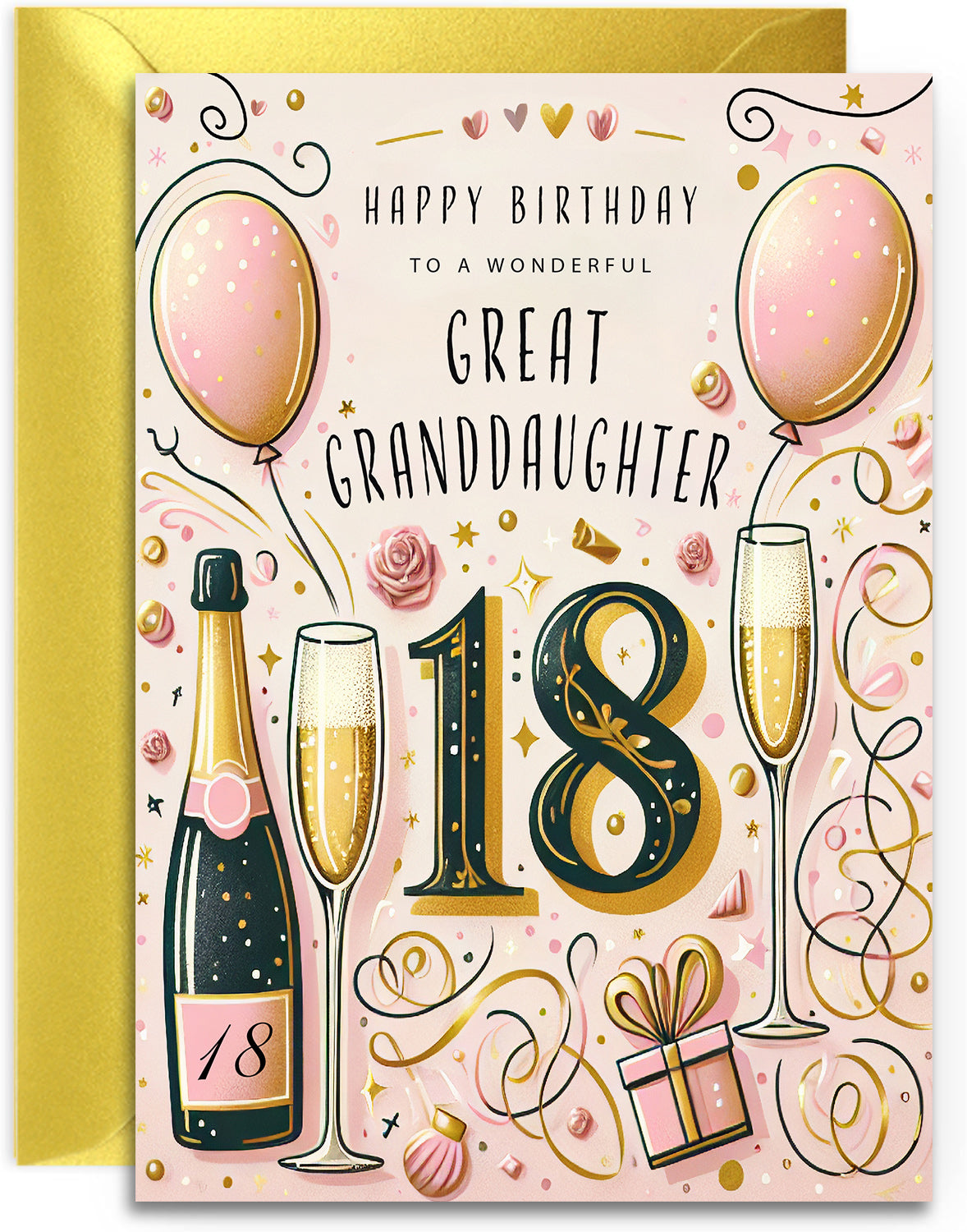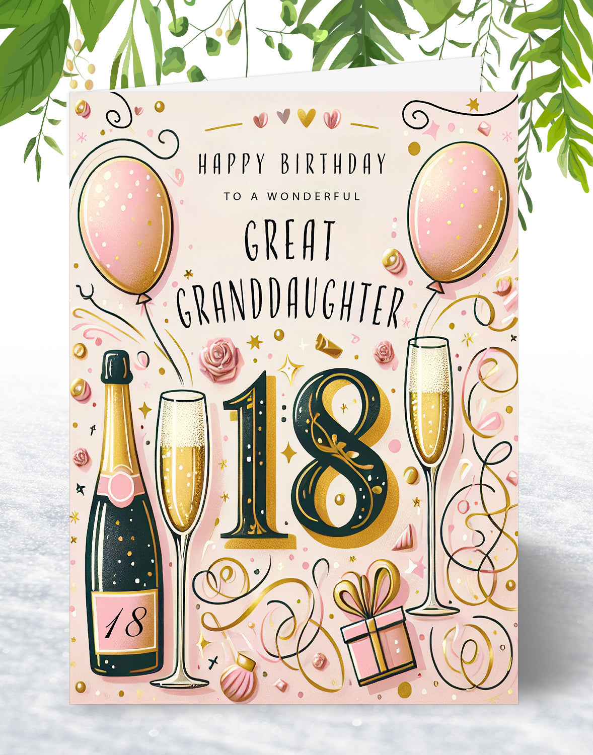 Great Granddaughter 18th Birthday Card - Champagne and Balloons design - Elegant Birthday Card for Her Age 18 with lovely verse inside. A5 with Gold Envelope