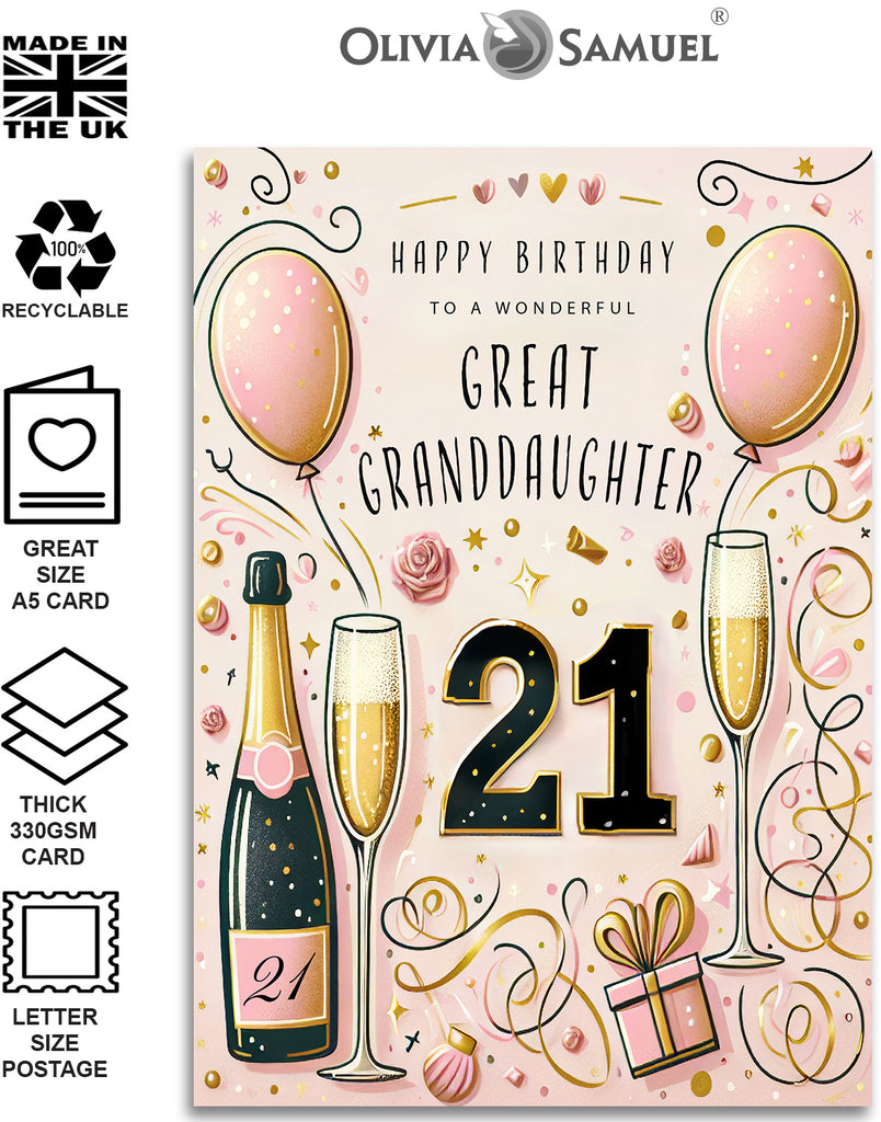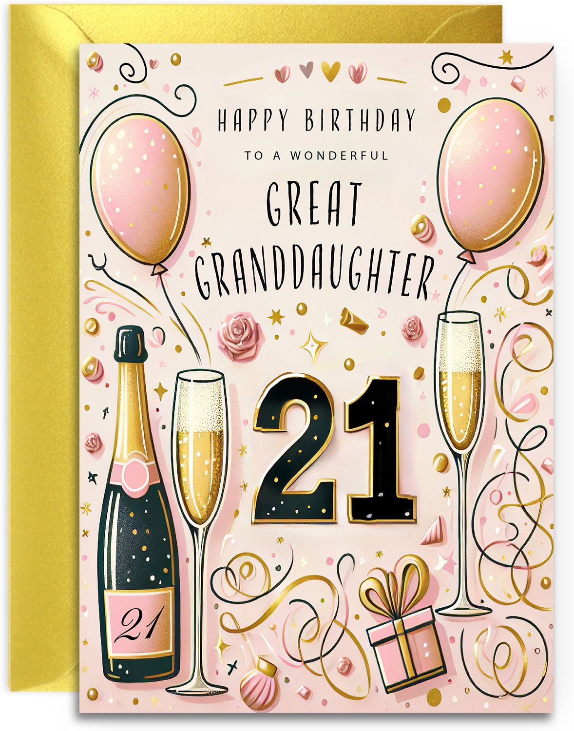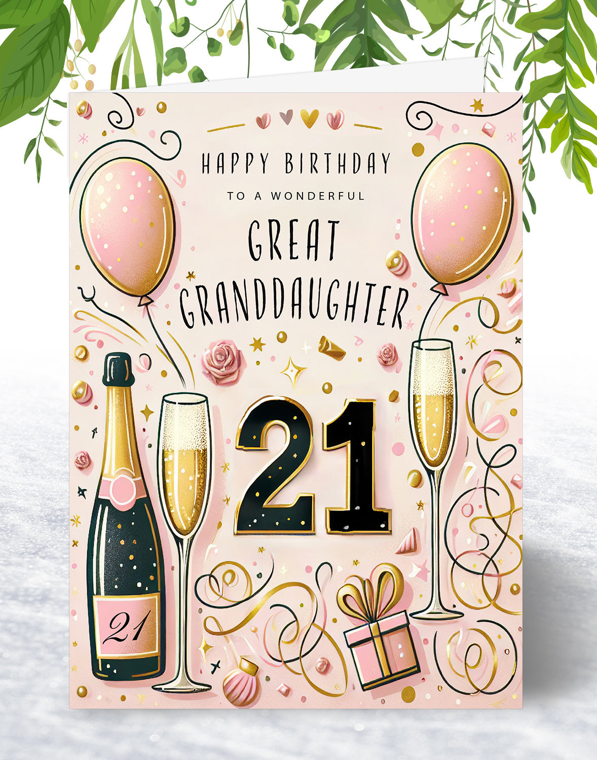 Great Granddaughter 21st Birthday Card - Champagne and Balloons design - Elegant Birthday Card for Her Age 21 with lovely verse inside. A5 with Gold Envelope