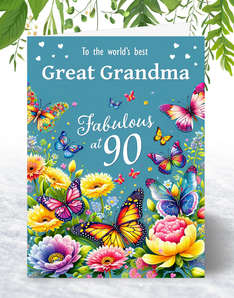 Great Grandma 90th Birthday Card - Happy Birthday - Fabulous at 90 - Pretty Flowers and Butterflies - A5 Size Card with Yellow Envelope is backordered and will ship as soon as it is back in stock.