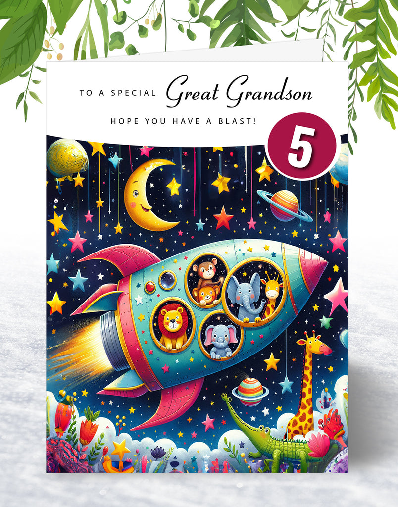 Great Grandson 5th Birthday Card - Space Rocket Design for a Special Grandson Age 5 with lovely verse inside. A5 with Grey Envelope is backordered and will ship as soon as it is back in stock.