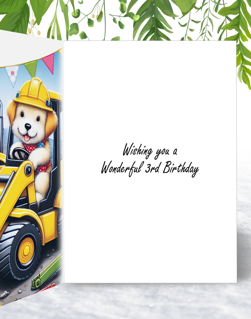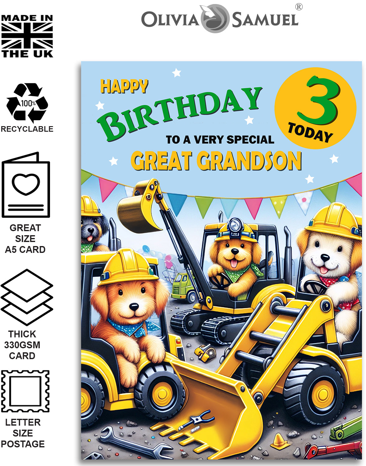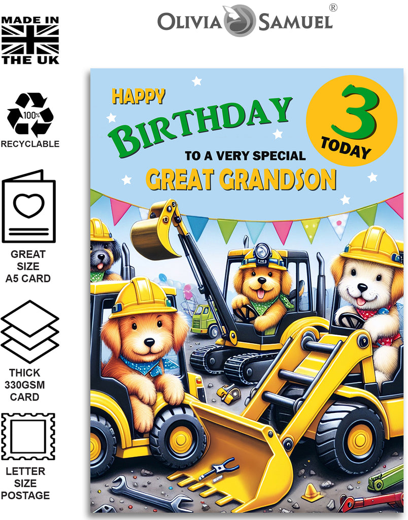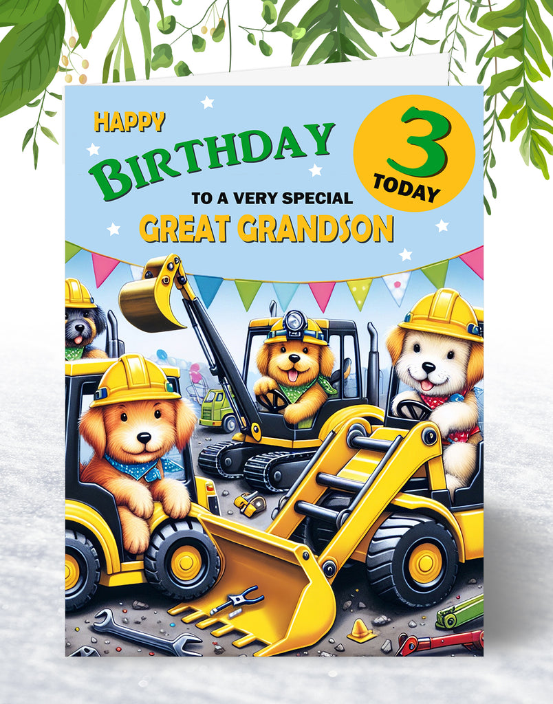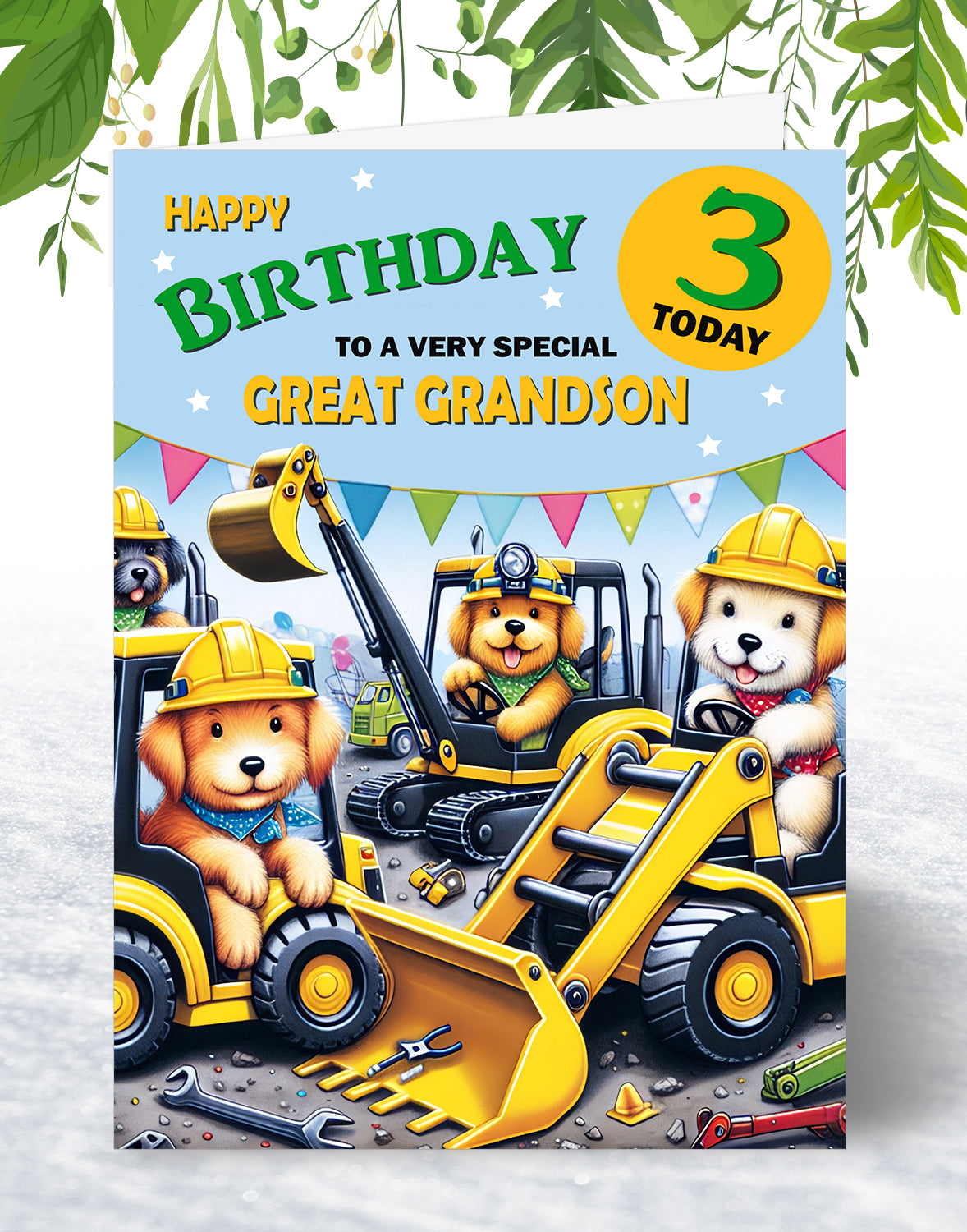 GREAT GRANDSON KIDS DIGGER 3RD BIRTHDAY CARD ⭐ Fun colourful digger construction design with adorable doggies ⭐ Click the second image for the text inside the card.