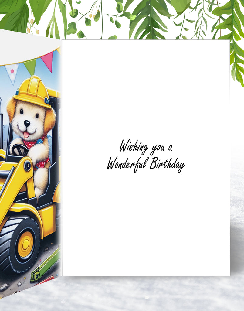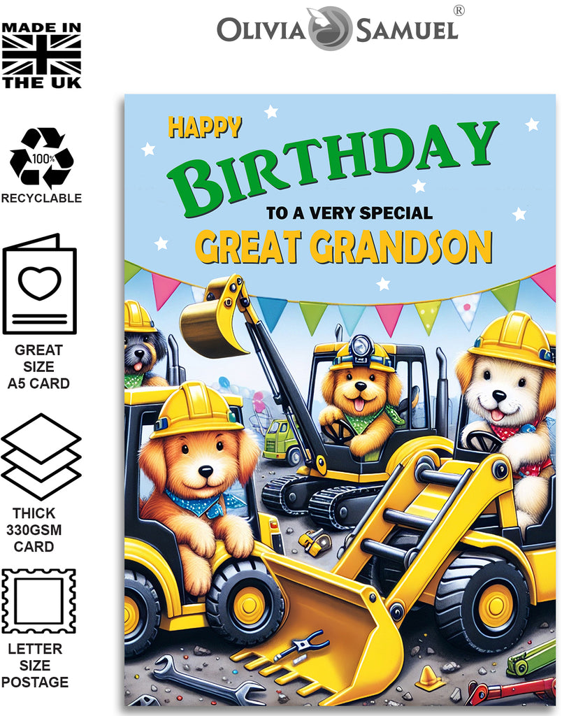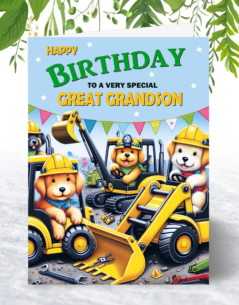 GREAT GRANDSON KIDS DIGGER BIRTHDAY CARD ⭐ Fun colourful digger construction design with adorable doggies ⭐ Click the second image for the text inside the card.