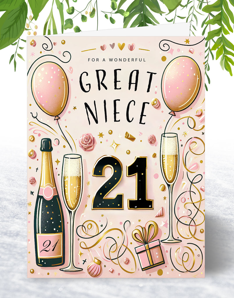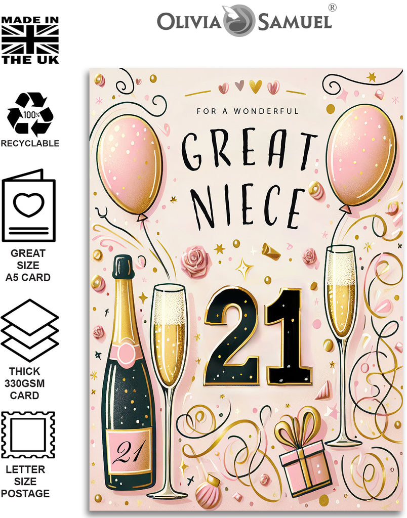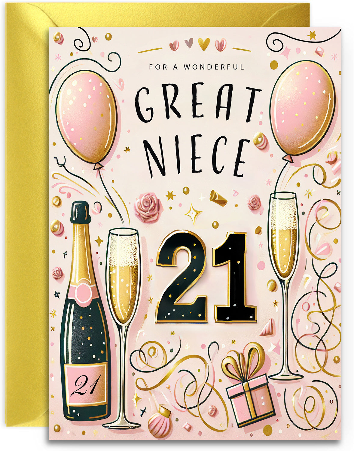 Great Niece 21st Birthday Card - Champagne and Balloons design - Elegant Birthday Card for Her Age 21 with lovely verse inside. A5 with Gold Envelope