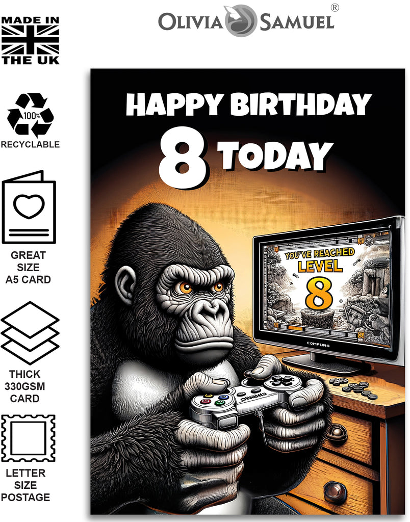 Gaming 8th Birthday Card - Level up Gorilla Design - A5 Size with Yellow Envelope. Funny Card for boy, cousin, friend, nephew, son, grandson. Designed and Printed in the UK