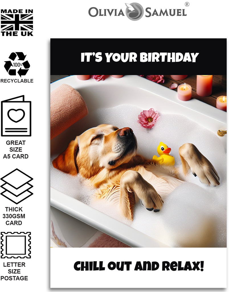 Golden Lab Birthday Card - Chill out and Relax - A5 Size with Pink Envelope. Funny Card for her, mum, nan, auntie, sister, daughter. Designed and Printed in the UK