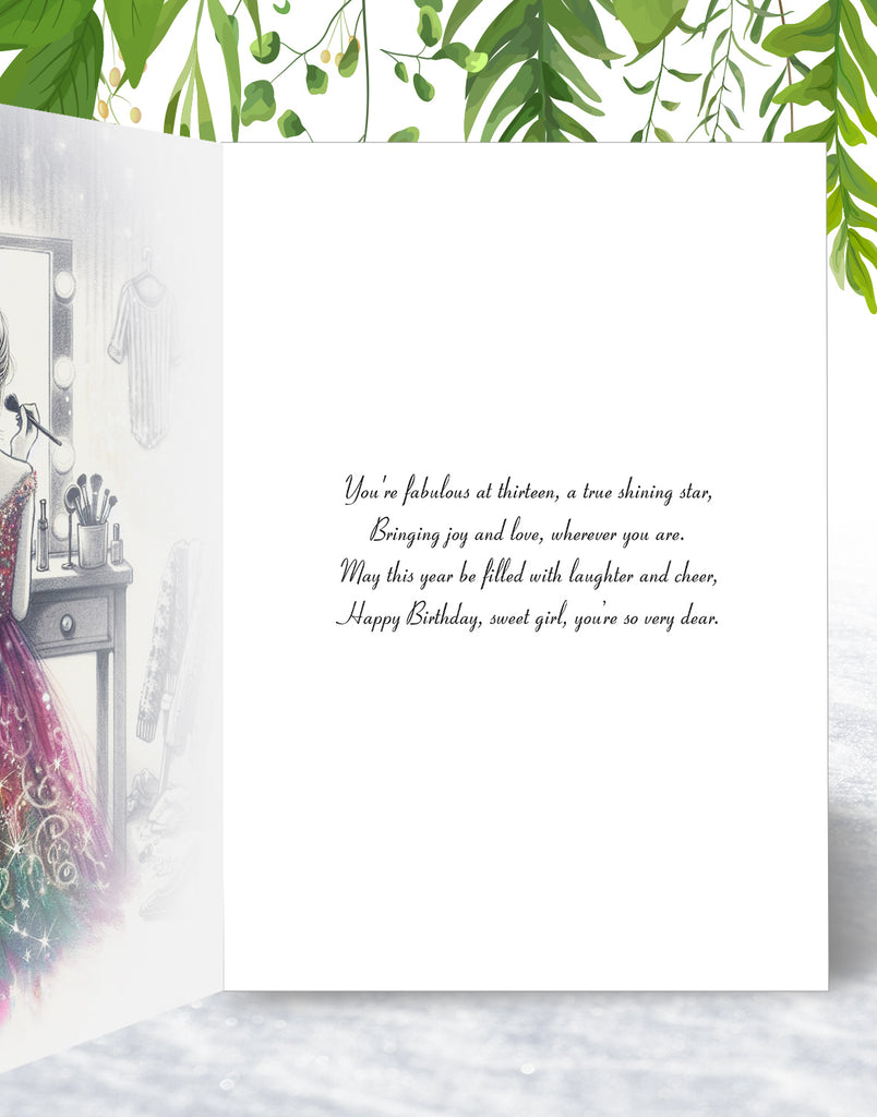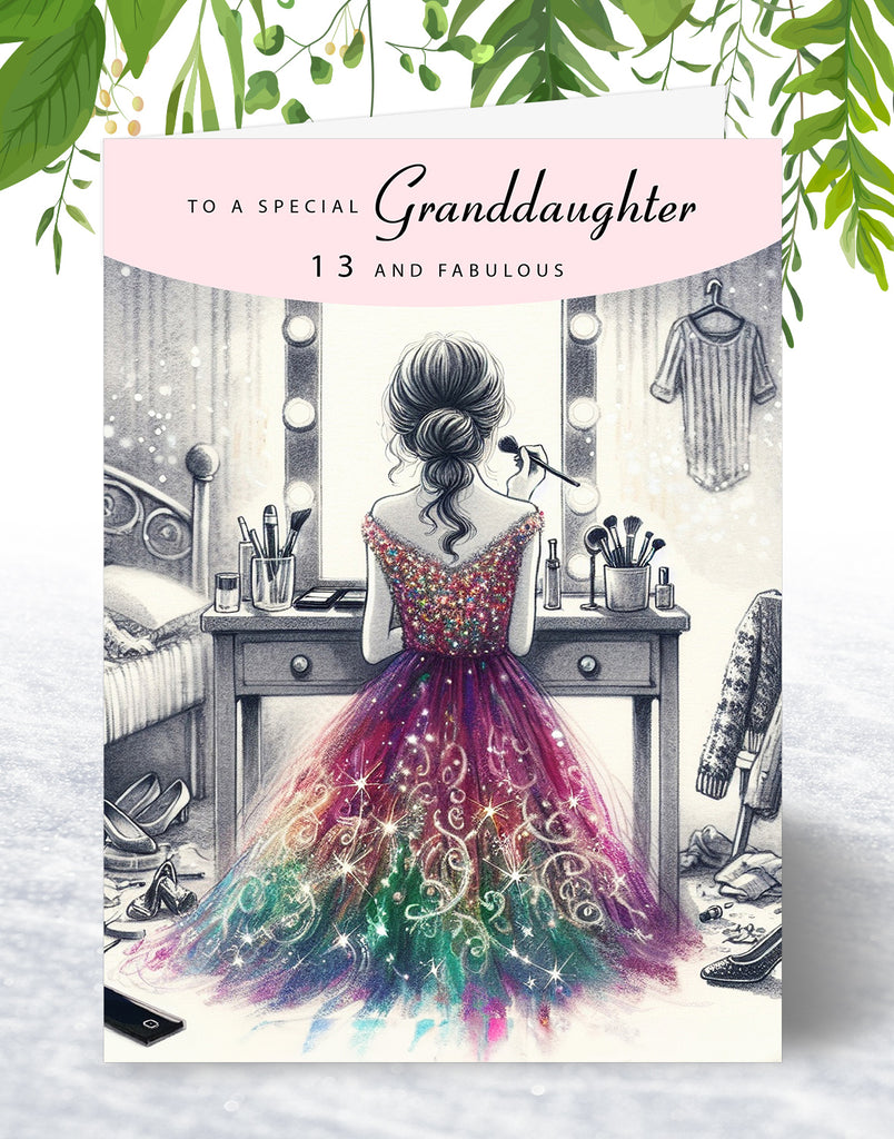 GRANDDAUGHTER 13TH BIRTHDAY CARD ⭐ Teenager getting ready for party design specifically for a 13-year-old Granddaughter ⭐ Click the second image for the text inside the card.