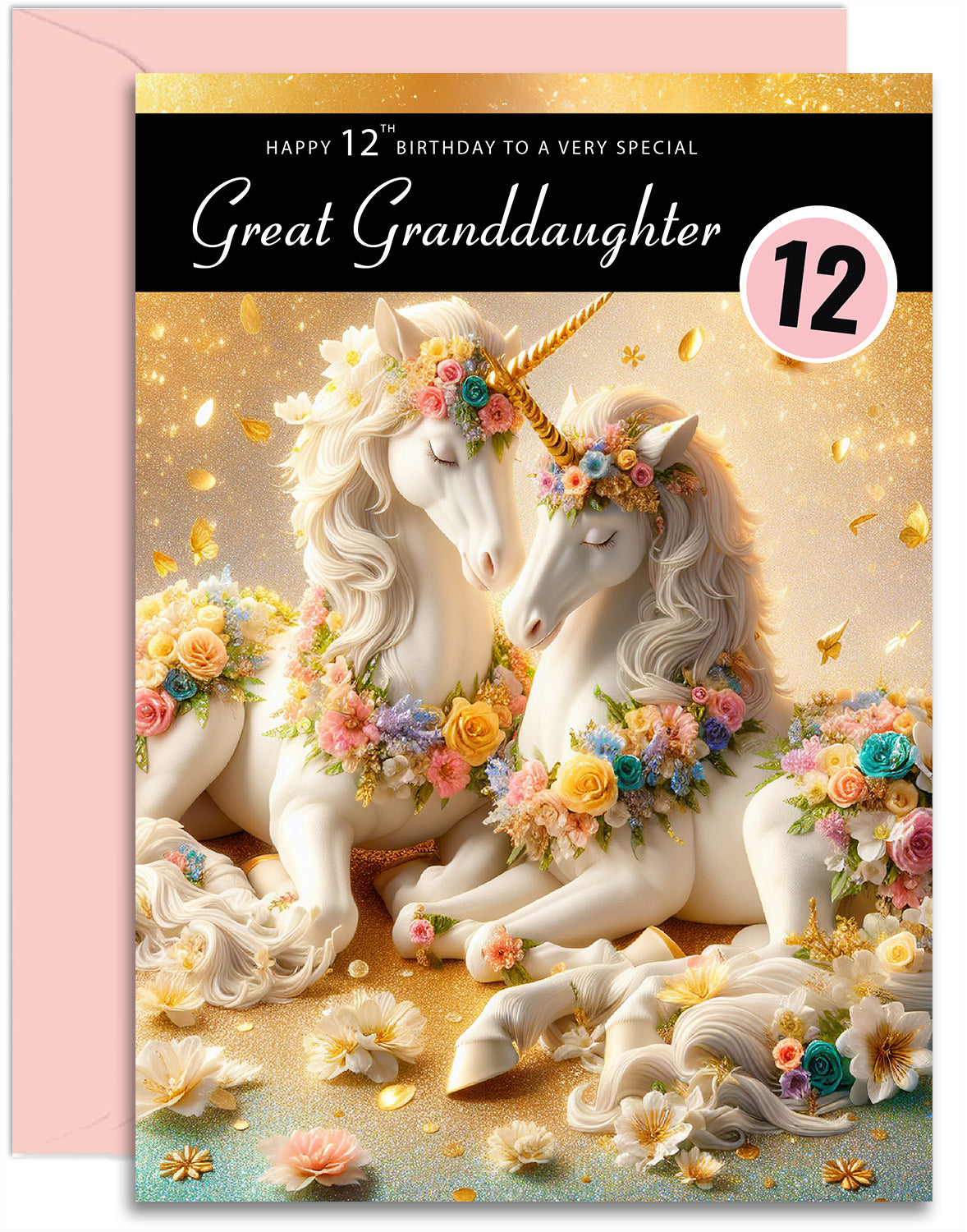 Great Granddaughter 12th Birthday Card - Magical Unicorns Design - Happy Birthday Card for Age 12 Great Granddaughter. A5 with Pink Envelope - Designed and Printed in the UK
