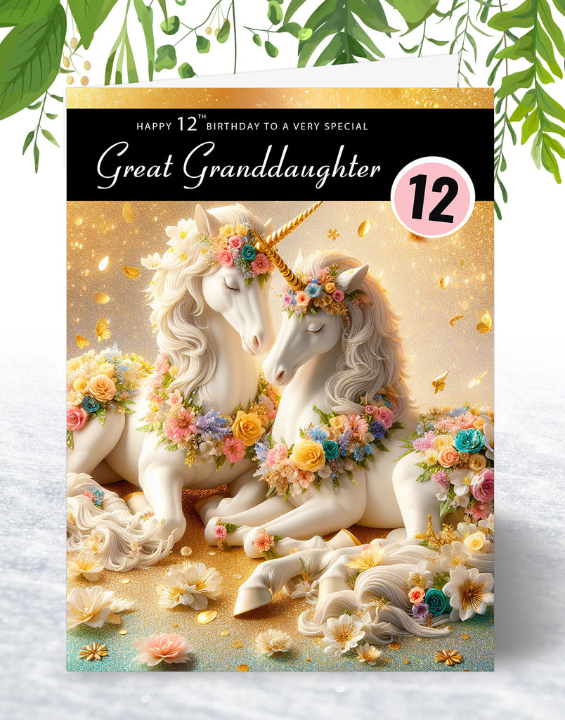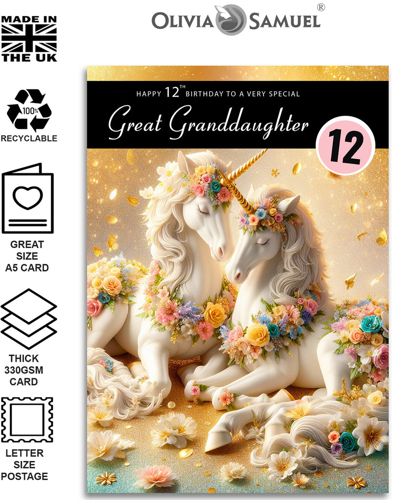 GREAT GRANDDAUGHTER 12TH BIRTHDAY CARD ⭐ Magical Unicorns Design ⭐ Click the second image for the text inside the card.