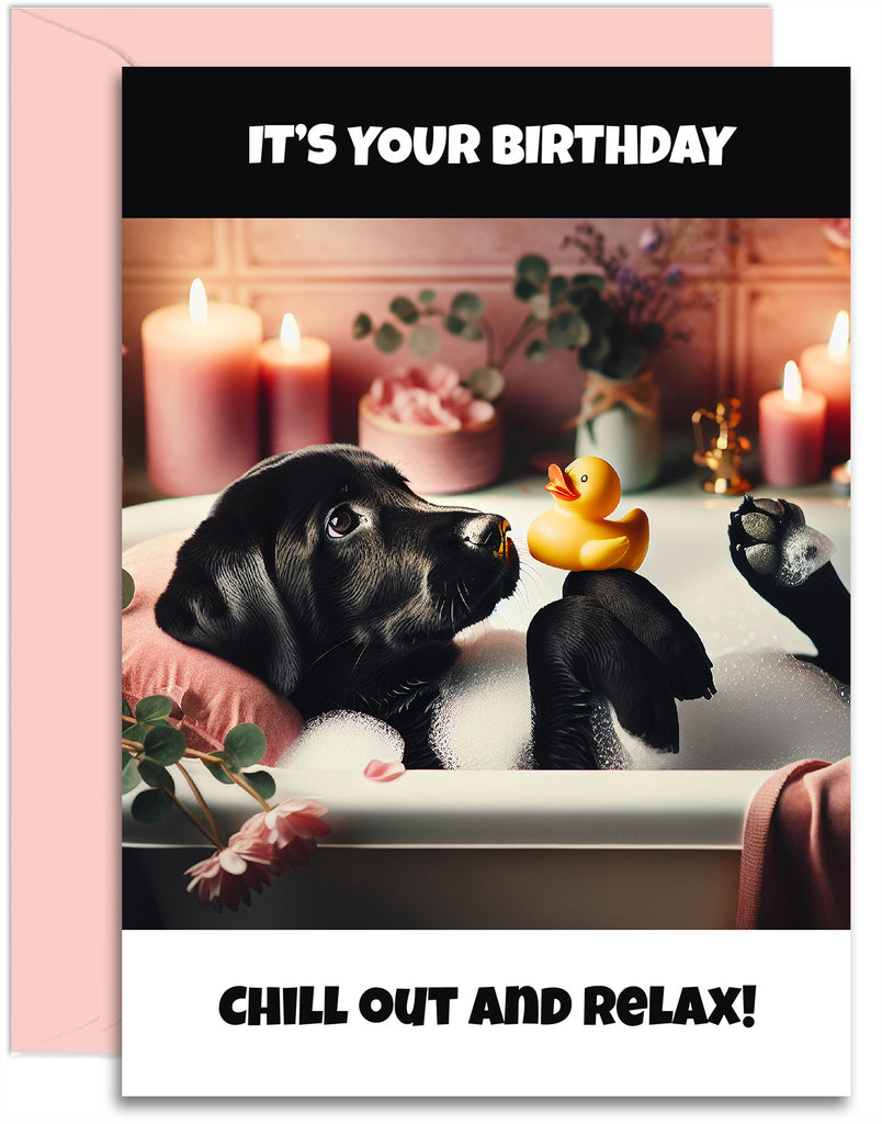 Black Lab Birthday Card - Chill out and Relax - A5 Size with Pink Envelope. Funny Card for her, mum, nan, auntie, sister, daughter. Designed and Printed in the UK