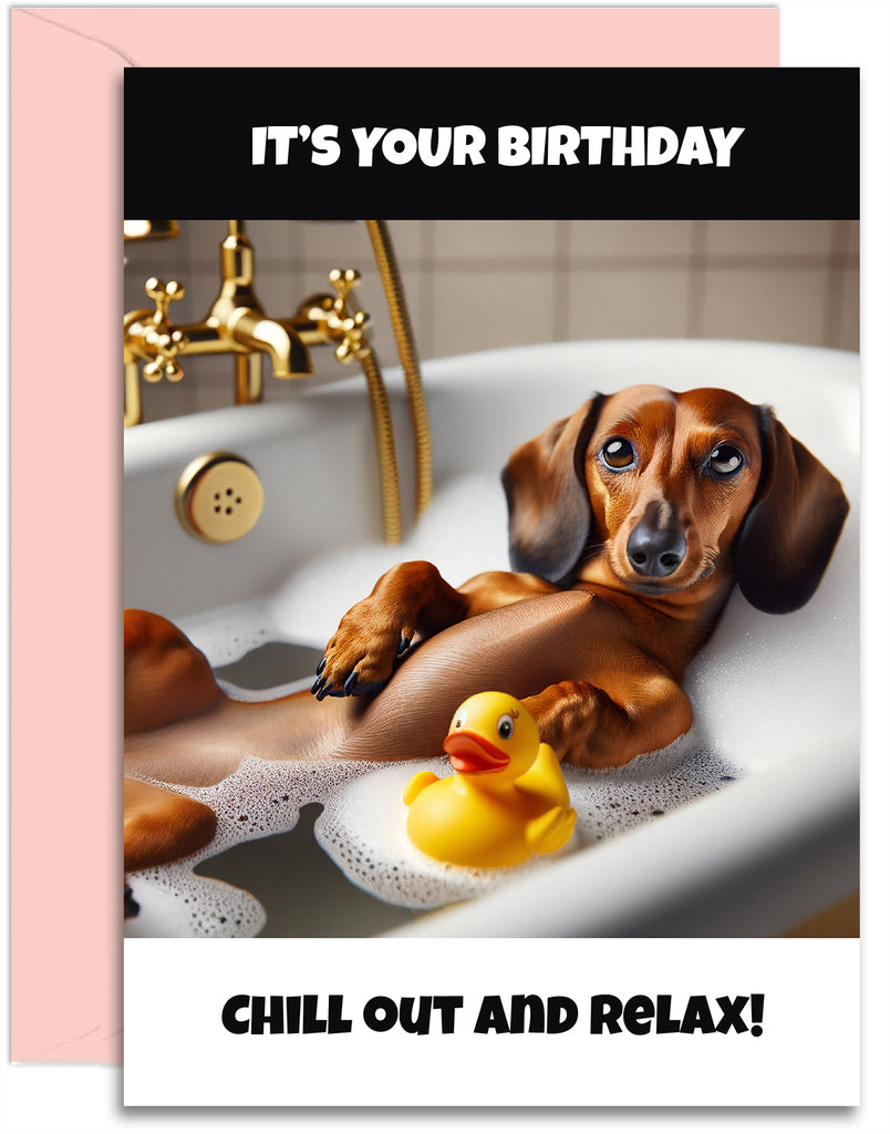 Dachshund Birthday Card - Chill out and Relax - A5 Size with Pink Envelope. Funny Card for her, mum, nan, auntie, sister, daughter. Designed and Printed in the UK